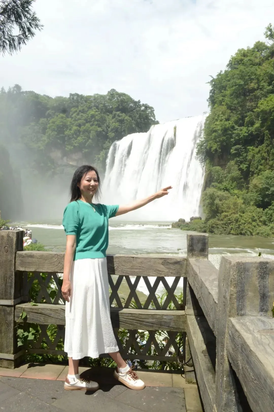 贵州黄果树瀑布,白色半裙配深绿色上衣,和场景协调一致,又有对比和层次感