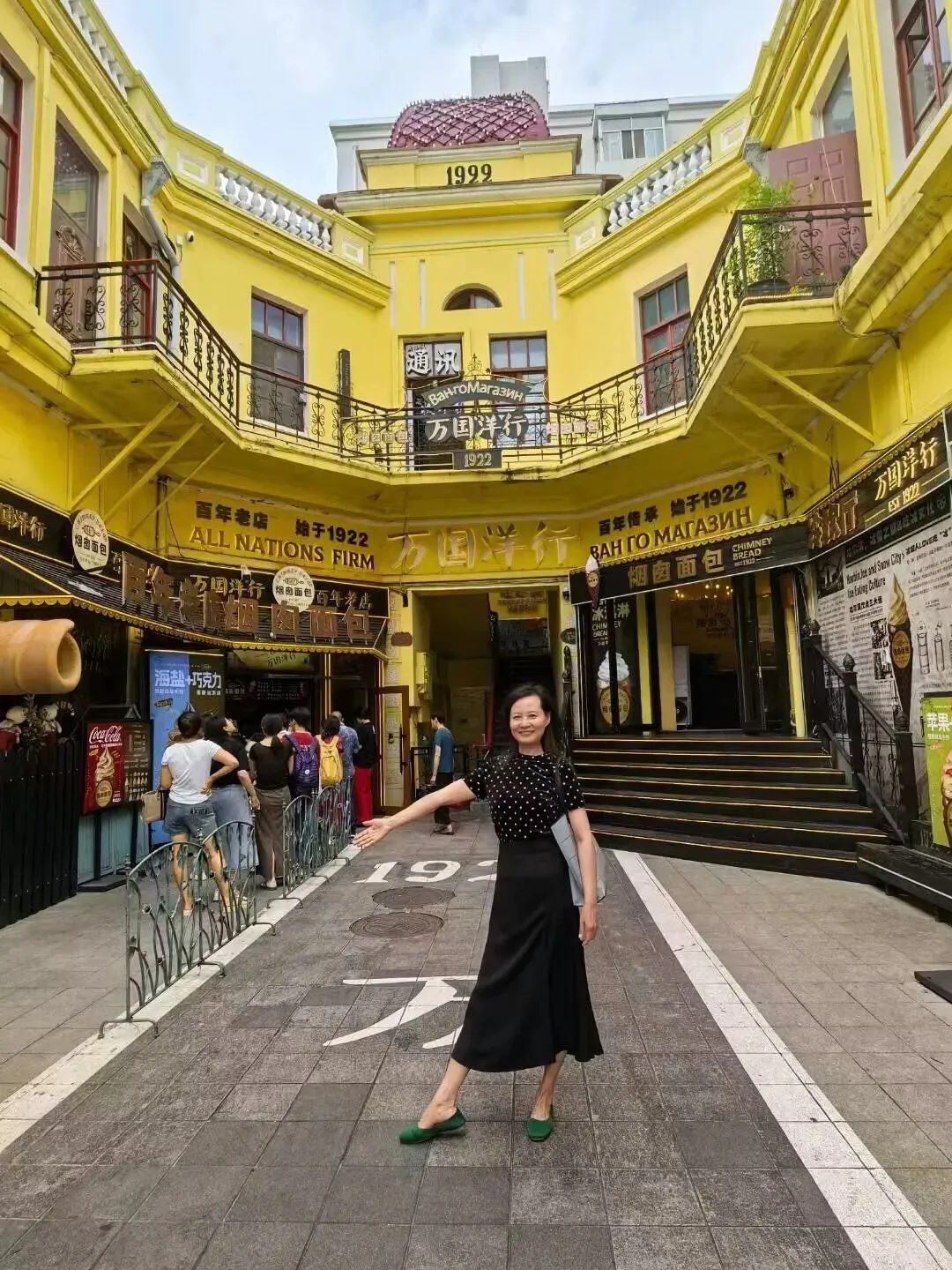 哈尔滨中央大街,欧式的建筑色彩繁多,场景也比较杂乱,黑色半裙加黑色波点上衣突出人物主体,优雅复古