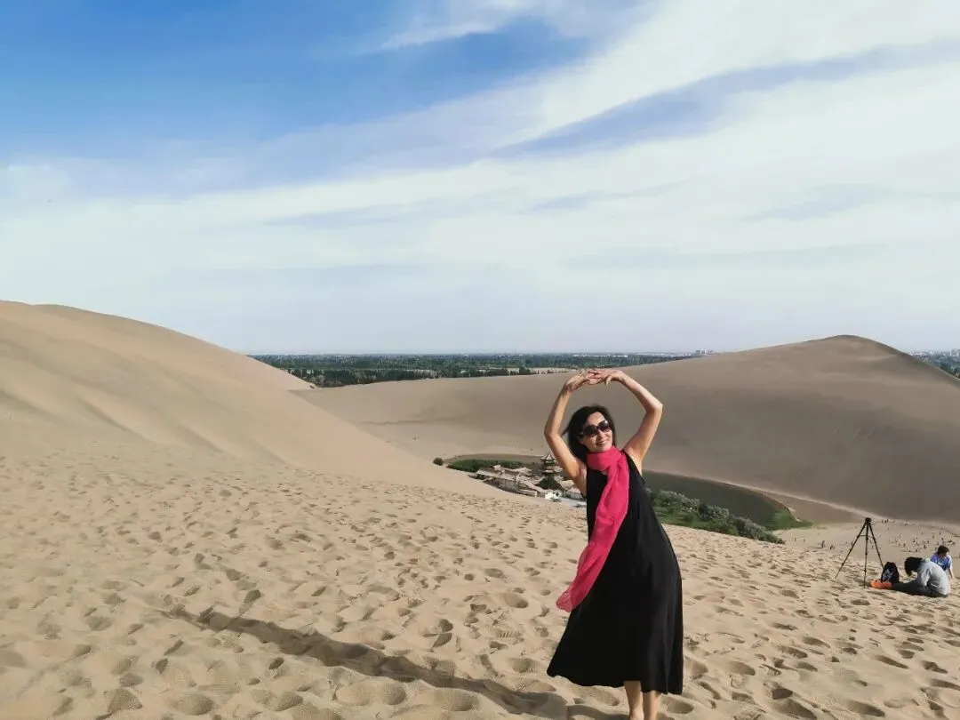 沙漠中太多人穿红色,也可以穿黑色(敦煌鸣沙山)