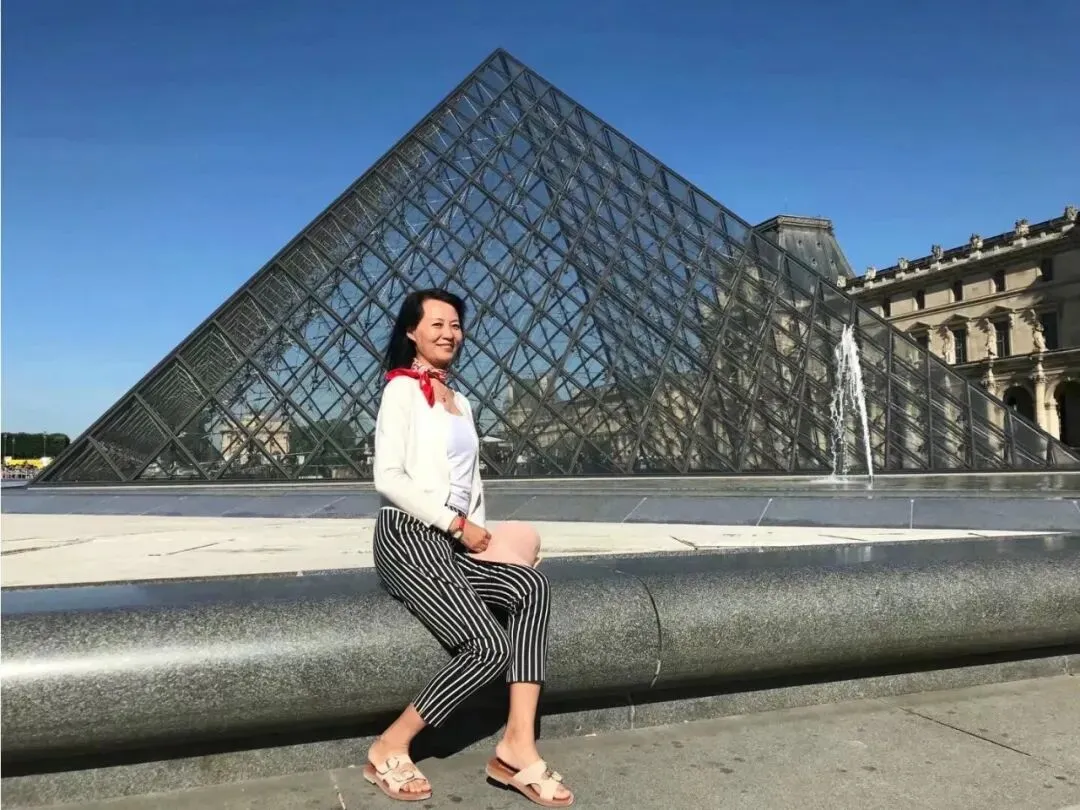 法国卢浮宫,黑色条纹九分裤加白色开衫,加上一条小丝巾,带点法式风情
