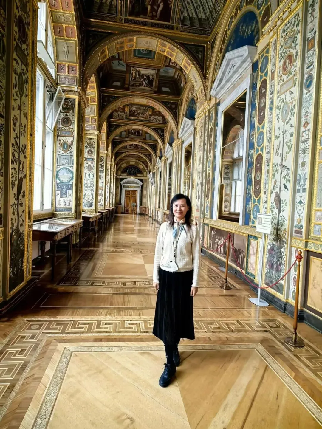 俄罗斯冬宫博物馆,白色小香风外套搭配黑色百褶裙,与馆内浓郁的艺术氛围相得益彰,简单的服饰更加衬托出这些艺术品的精美