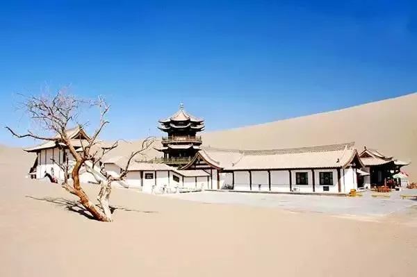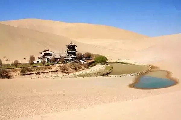 鸣沙山,山为流沙积成,沙分红、黄、绿、白、黑五色。在刮风时会发出声响故称鸣沙山。月牙泉边园林里盛开的繁花则与周围漫天的黄沙形成了有趣的对照。