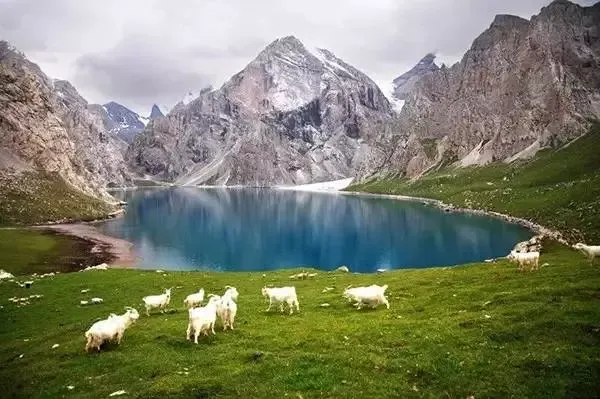 湖前是一片广阔的草原,春夏季节,草原上牛羊成群,湖面水鸟、野鸭游弋,偶尔还有天鹅在此觅食。湖水在阳光的照耀下,流光溢彩,倒映着雄伟的幕士塔格峰,绚丽异常。