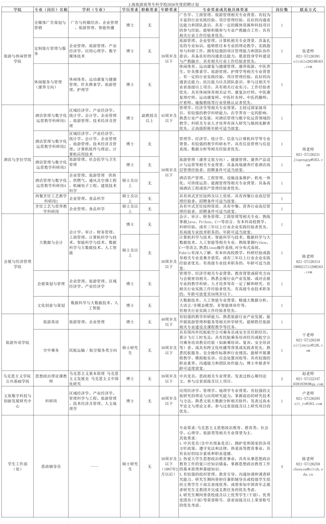 【上海】2026年上海旅游高等专科学校工作人员招聘公告