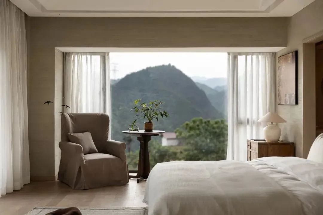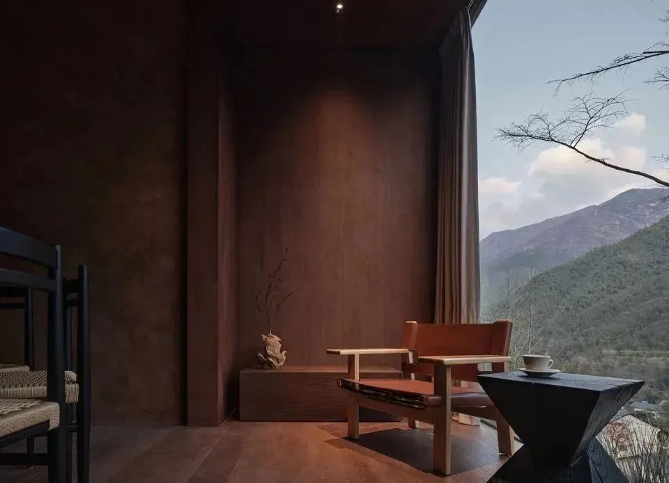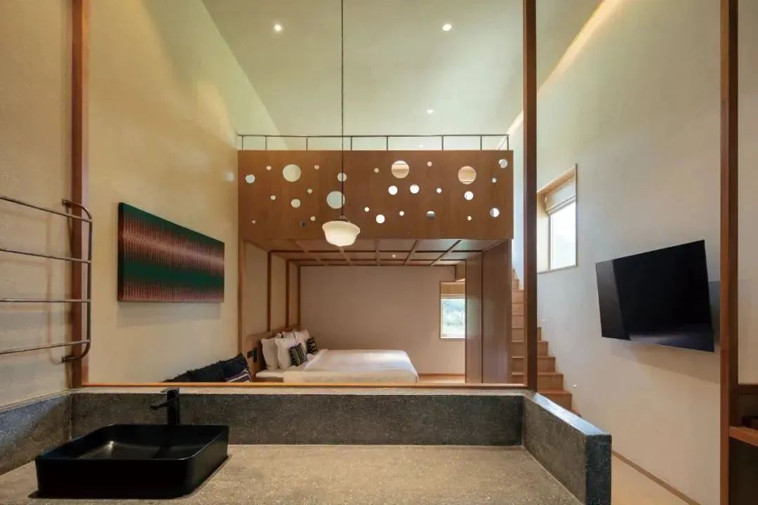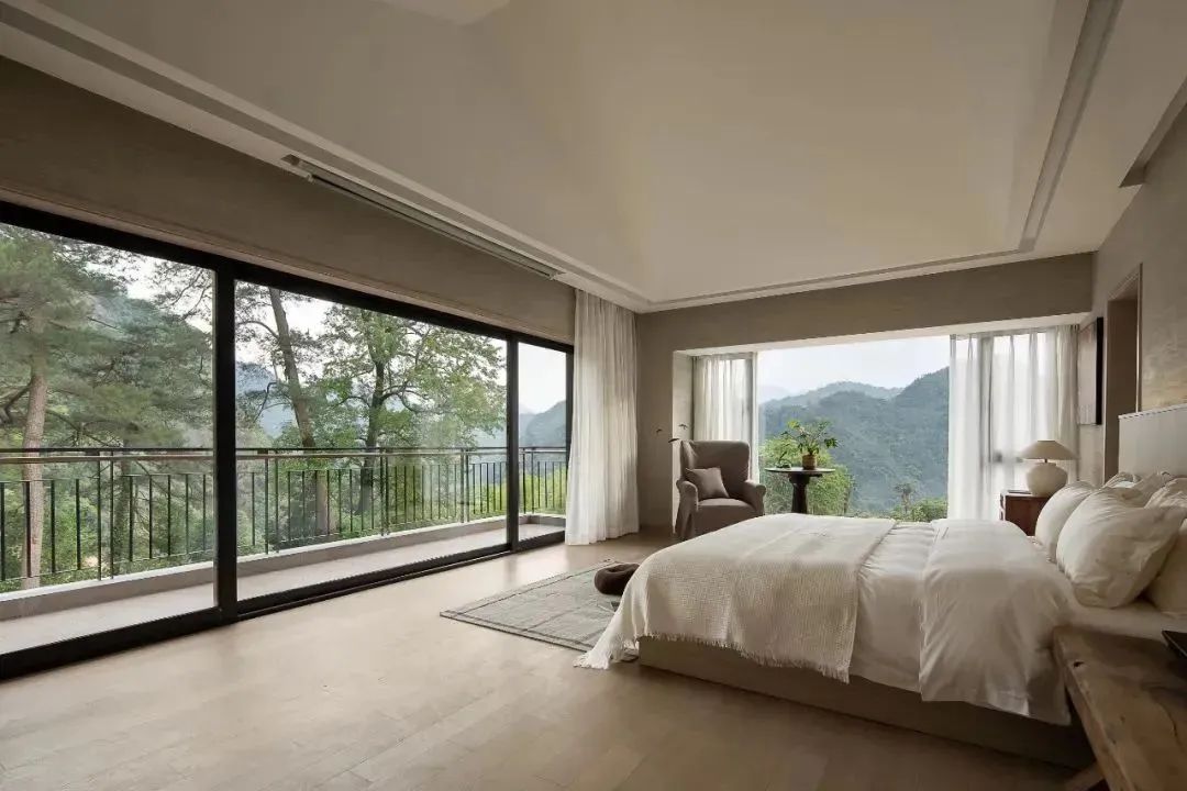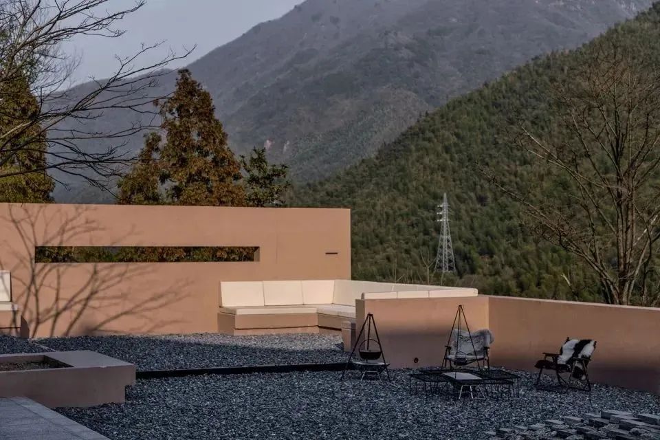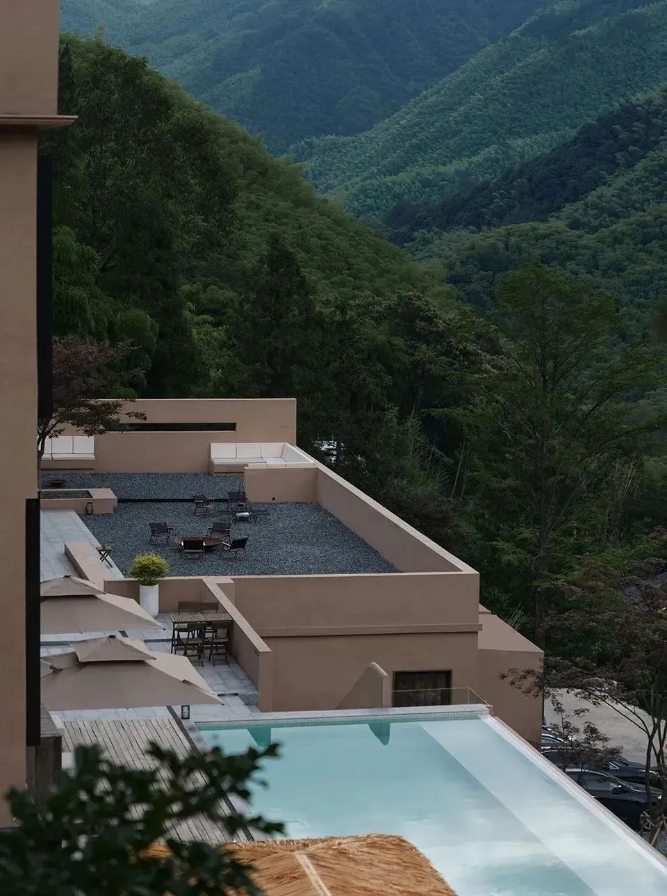 建筑延伸出的观景平台以及露天泳池,让居住者近距离的深入自然。山水、草木、乱石浑然一体,主理人的“山野宜居”的经营理念,得到了实际的落地。无论是室内的居住空间还是户外的活动场地,目光所至之处必是郁郁葱葱。