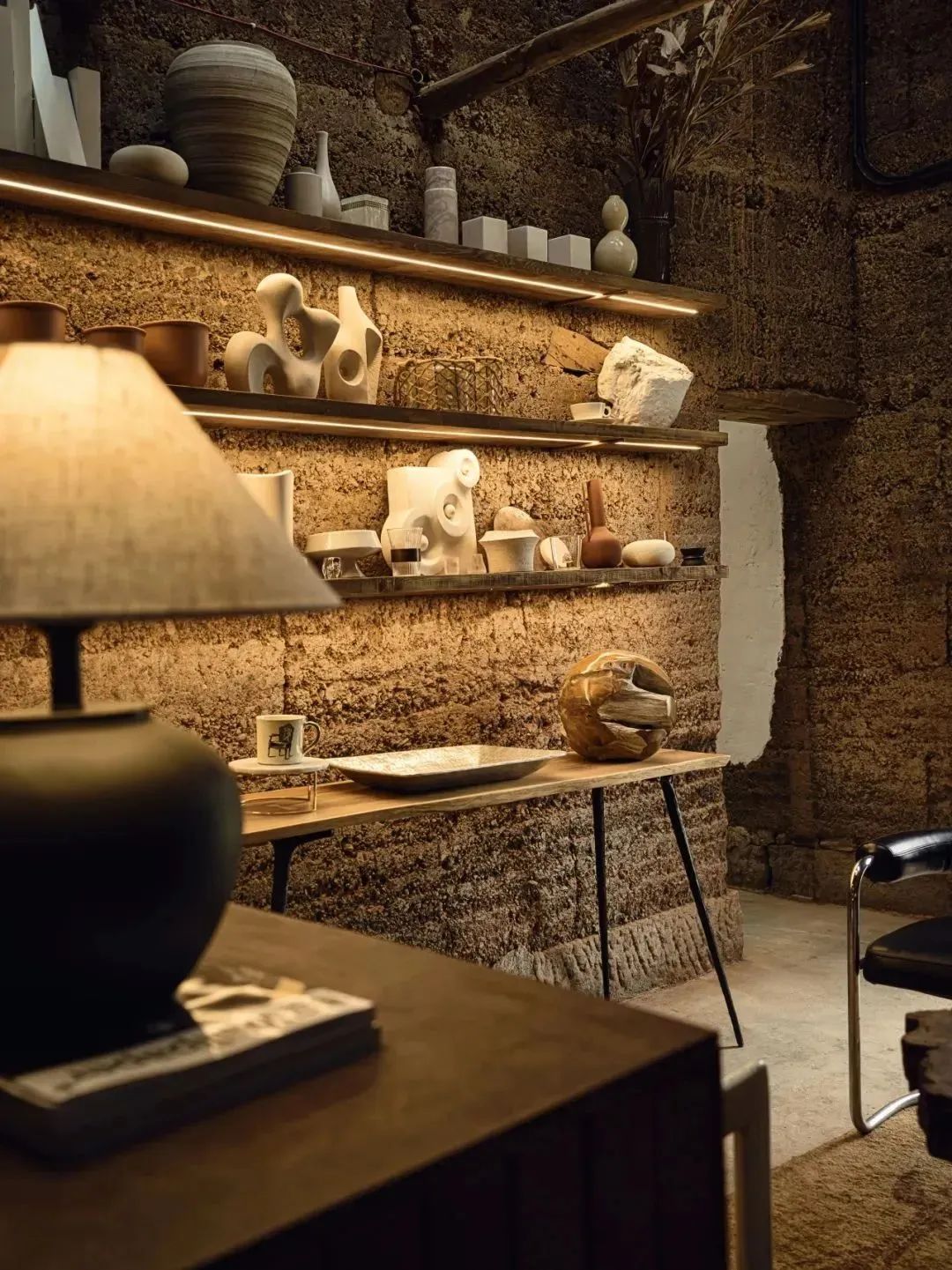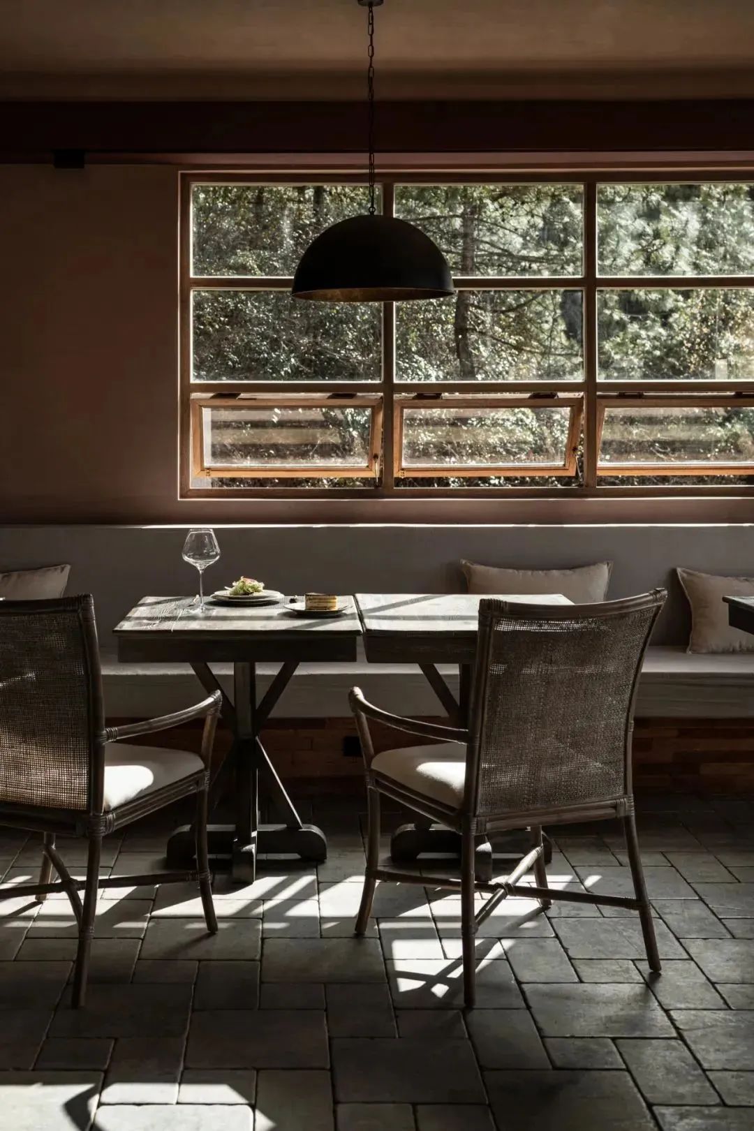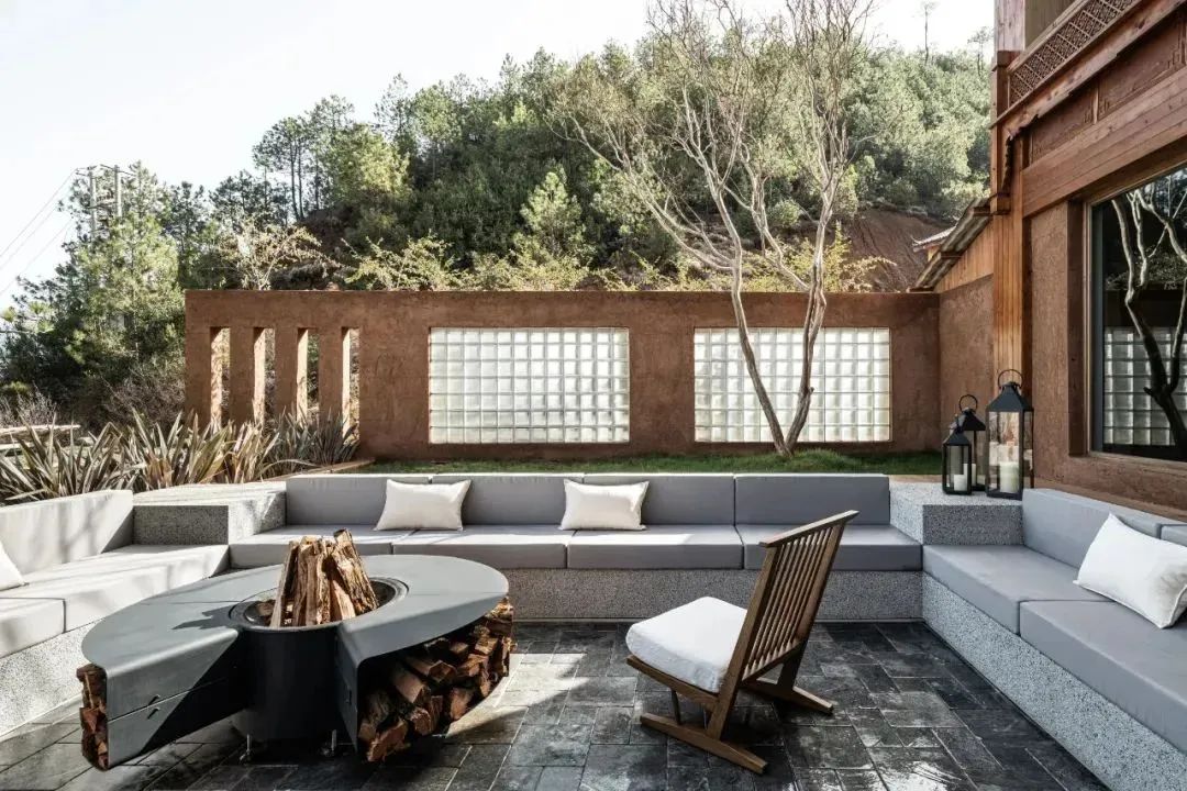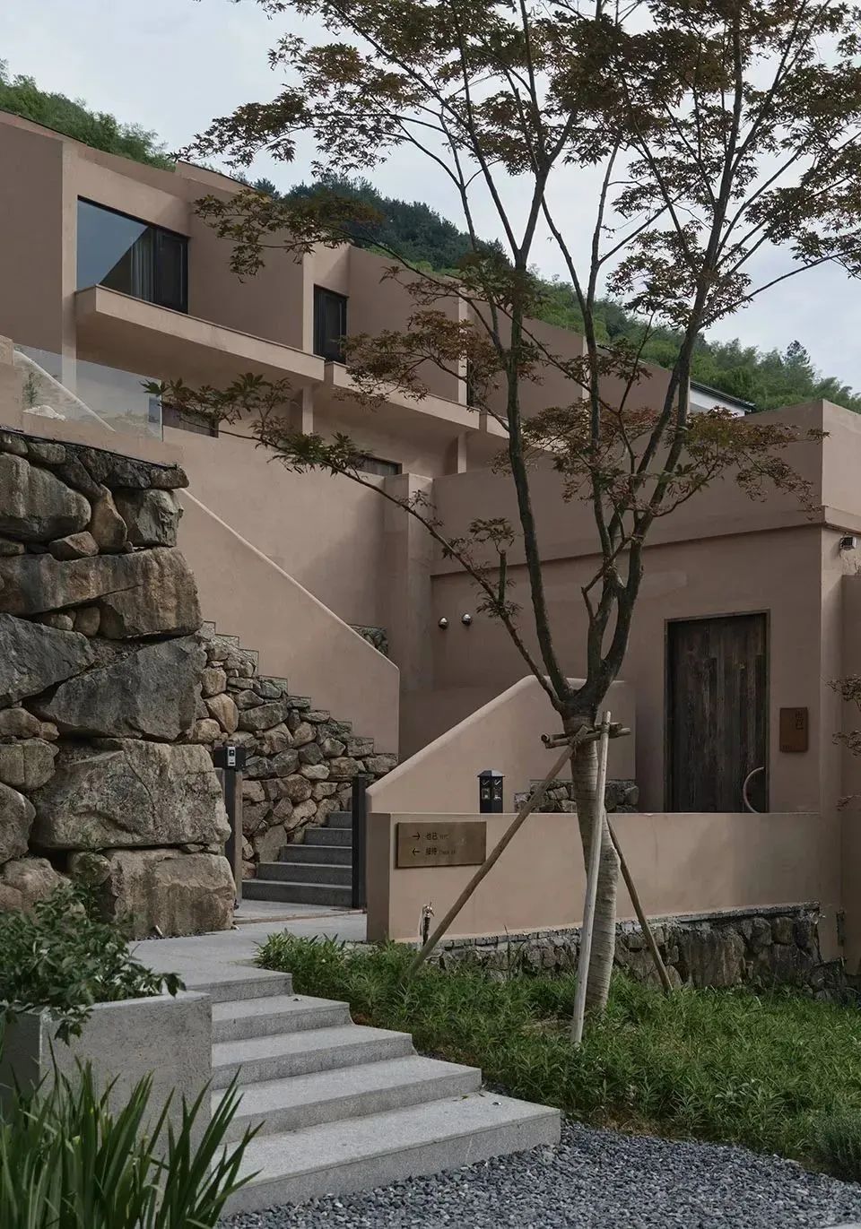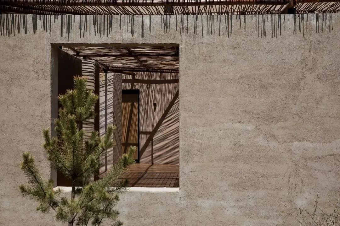 在外墙的打造上,设计师以水泥砂浆抹泥的特殊工艺还原当地民居的夯土外墙,打造一种久经风霜的做旧质感。