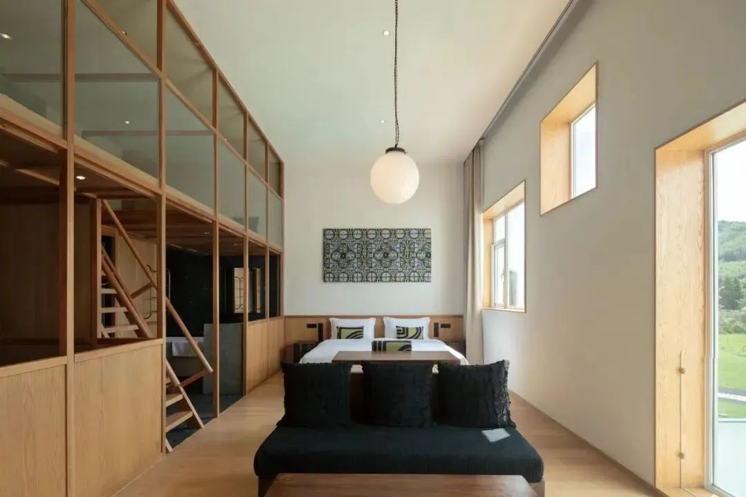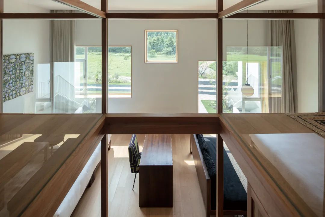 东楼的公共空间拥有双层挑高,与大面积的玻璃材质一同打造通透的视觉感受,在二楼的五间套房与一楼公共区实现隔而不断的体验,可以再局部的空隙处俯瞰整个一楼空间。这里更像是一个小的四合院社区,既能够轻松的进入公共区域,也能拥有自处空间。