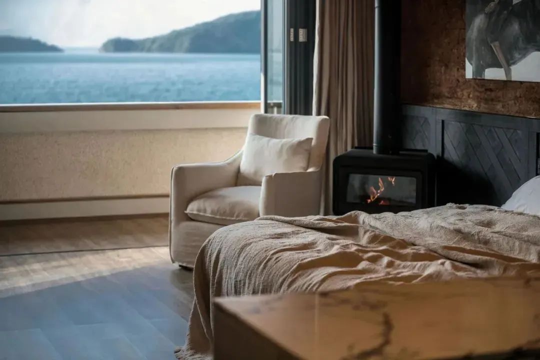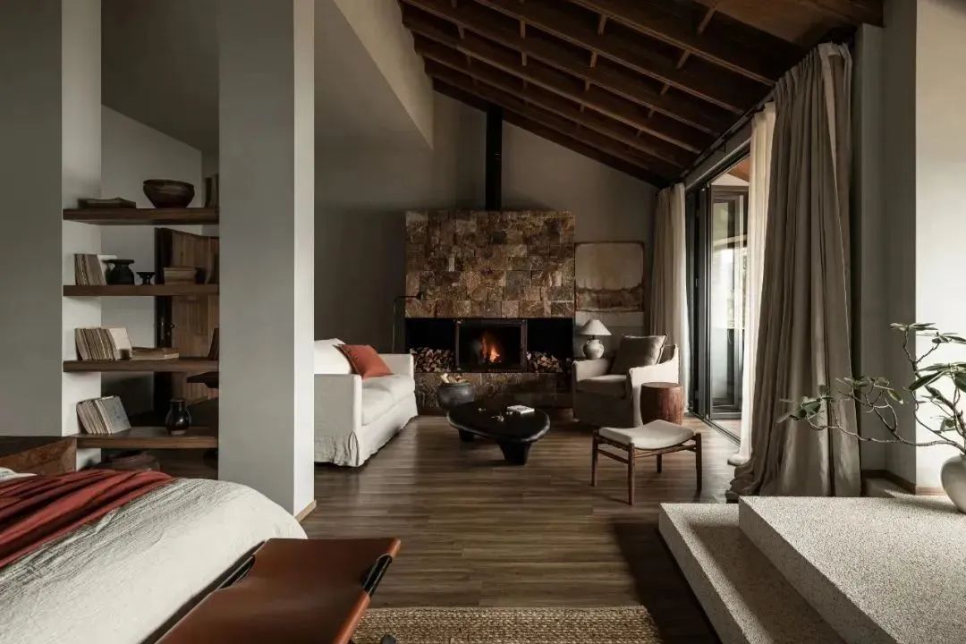 居住空间与周遭山脉、森林、湖水的有机链接,室内空间大量由老木头制作的家居,带有包裹感的沙发、囊括自然美景的窗棂,让诗意栖居的情绪在环境中扩散、蔓延,让身体与心灵都同时安顿于此。