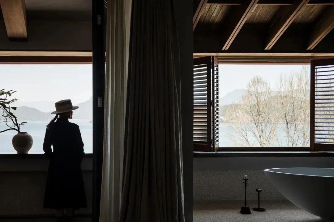 比起传统的设计符号,设计师更为关心的是住进民宿后的生活体验,舒适恬淡成为现代语境中难得的珍贵感受。在松林环伺的民宿中呷茶望湖,品酒观景,体验自然本真的湖光山色。