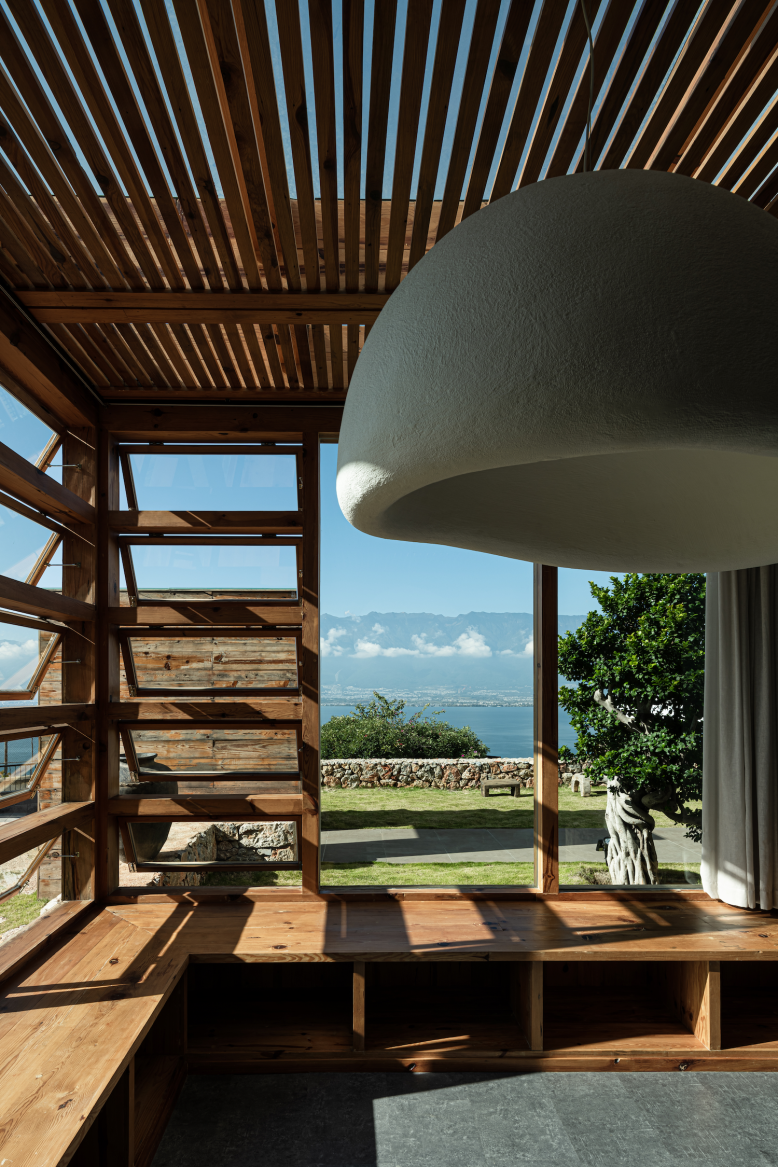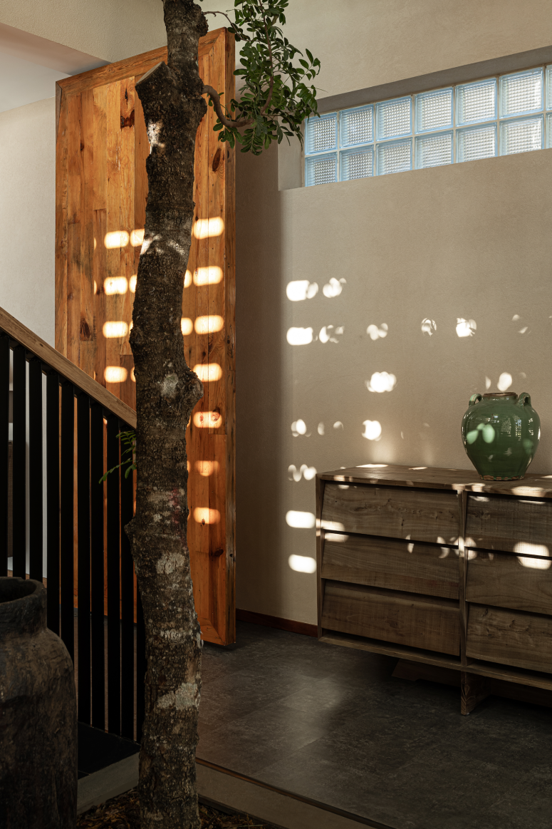 阳光自由的穿梭在木格栅,粗粝墙体、与玻璃砖屋顶之上,而室内常见的石、木、土营造了整体的自然特质。传统木制家具与现代优雅生活的和谐统一。散漫的静坐于此,感受时光的流逝。