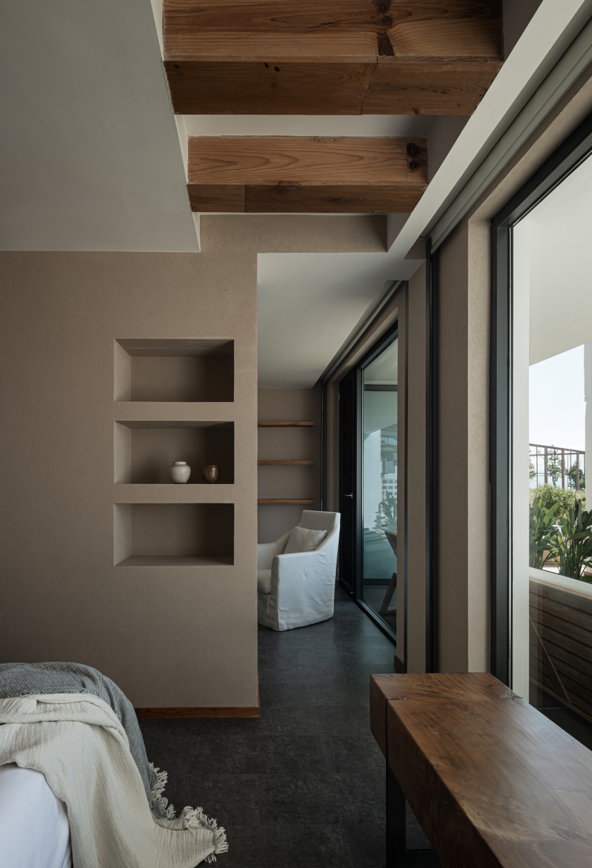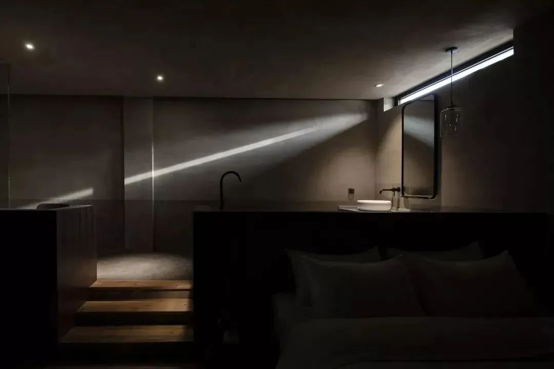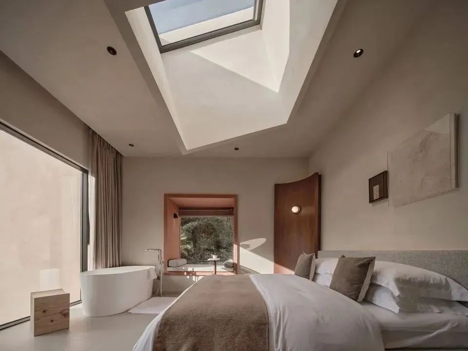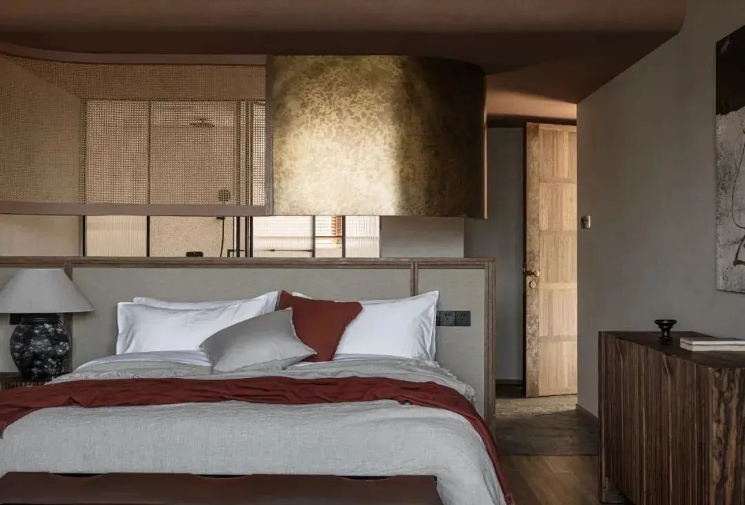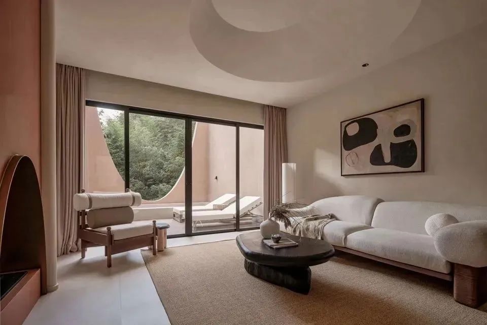 独特的U形建筑,是相邻居所之间的视觉屏障,让客房在保持私密性的同时,又最大限度的引入自然光线与景观,独享一方天地。柔和曲线追随光的移动,阴影在墙面扩散又消失,更显灵动自然。