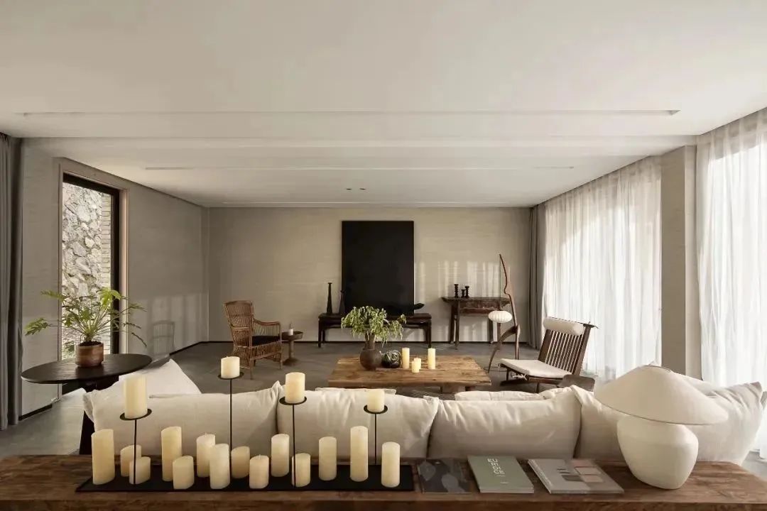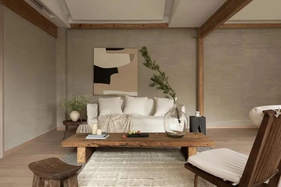 亚麻布面沙发、古朴木制家具与绿色植物相互点缀,散发着淡淡的诗意。在这样的空间当中,居住者能暂时的放下疲惫,享受窗外的自然风光。在与自然的对话中,实现“天人合一”,获得内心的充盈。
