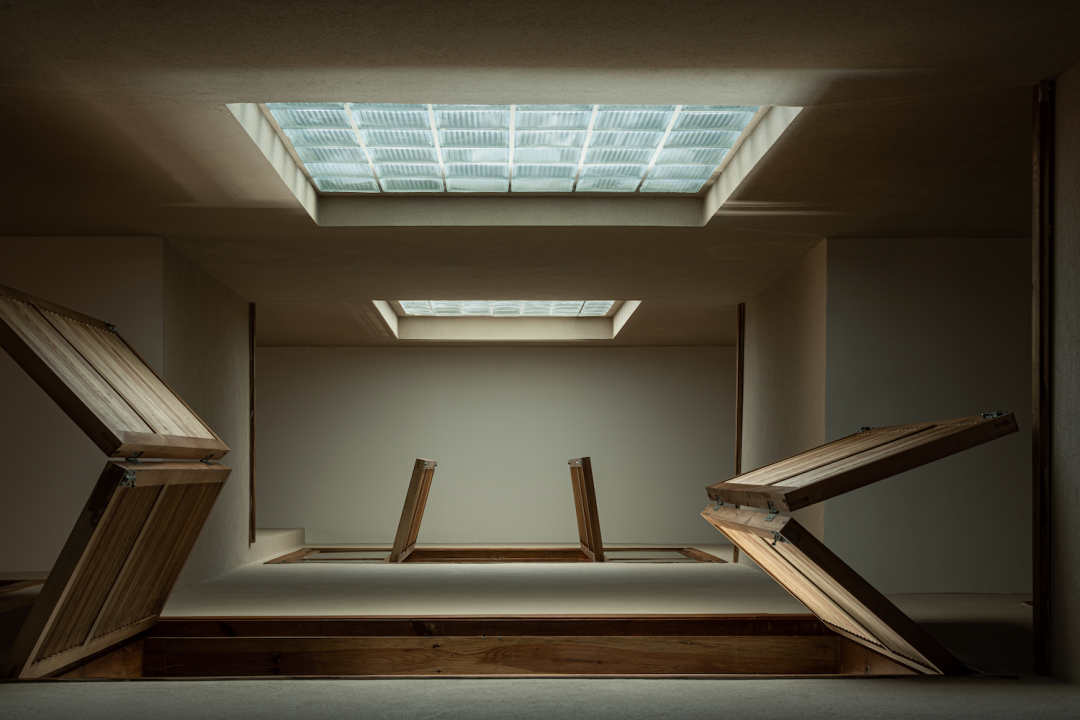 在居住空间的设计中,将外墙的黄褐色墙体延续至室内,让整体氛围变得更为沉静。天窗与落地窗所带来的通透感,仿佛真实的置身自然,以天为被以地为席。