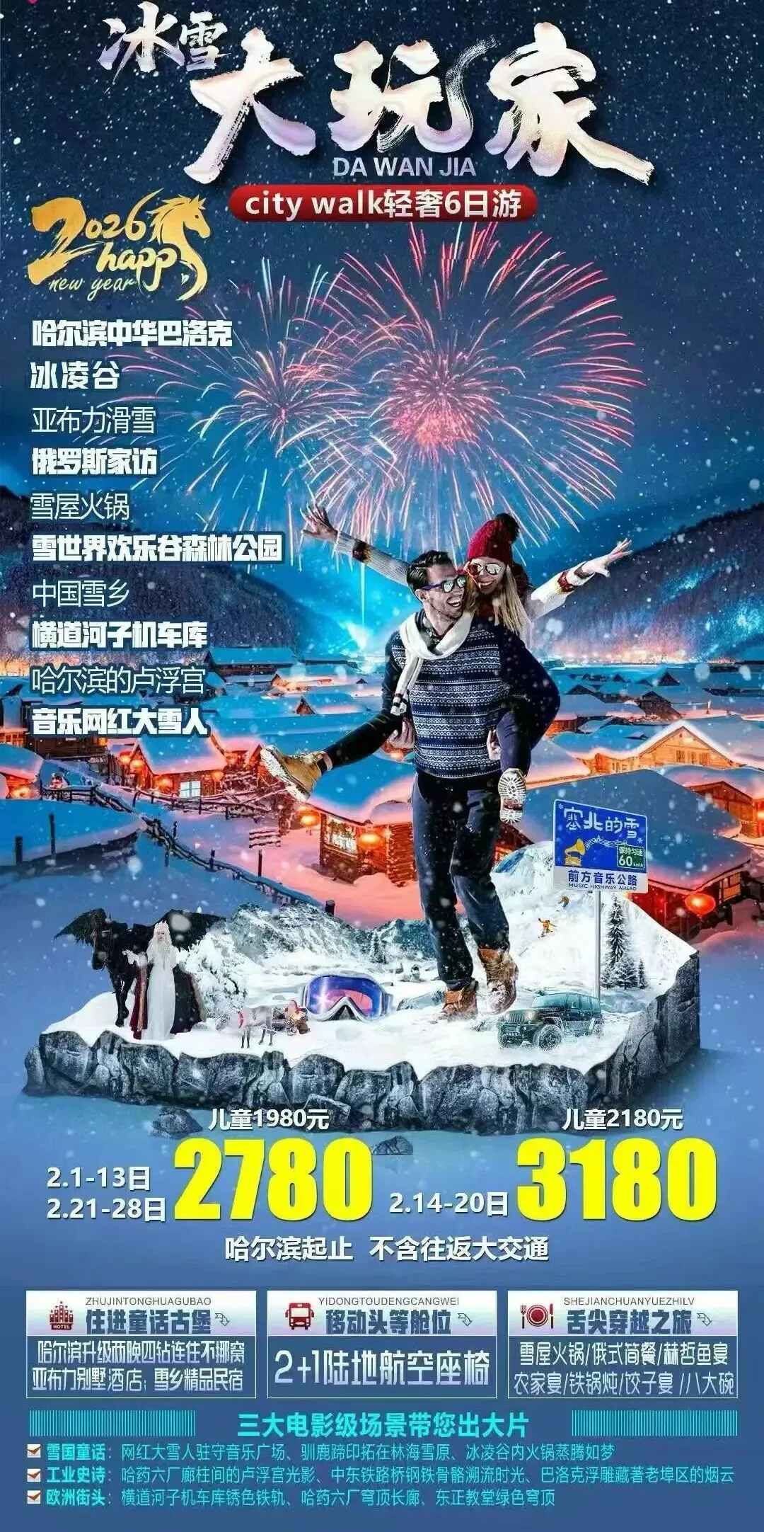 哈尔滨中华巴洛克、冰凌谷、亚布力滑雪、俄罗斯家访、雪屋火锅、雪世界欢乐谷森林公园、中国雪乡、横道河子机车库、哈尔滨的卢浮宫、音乐网红大雪人。