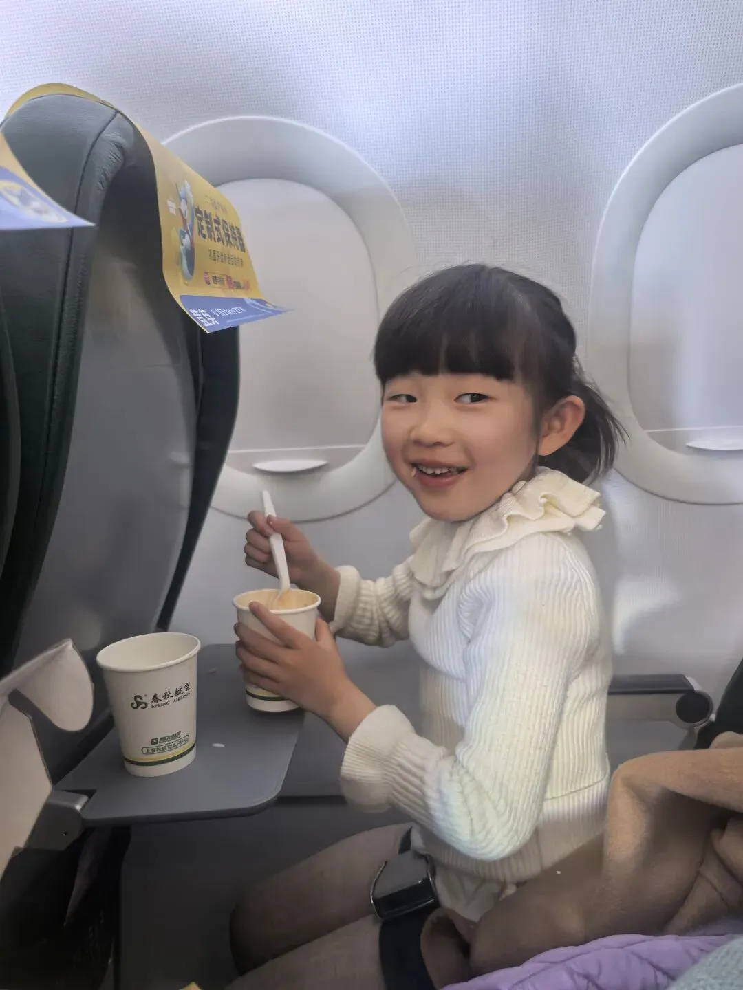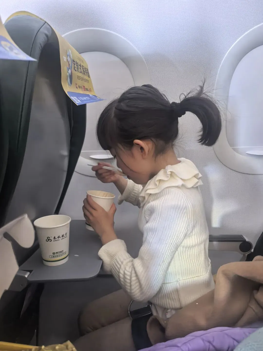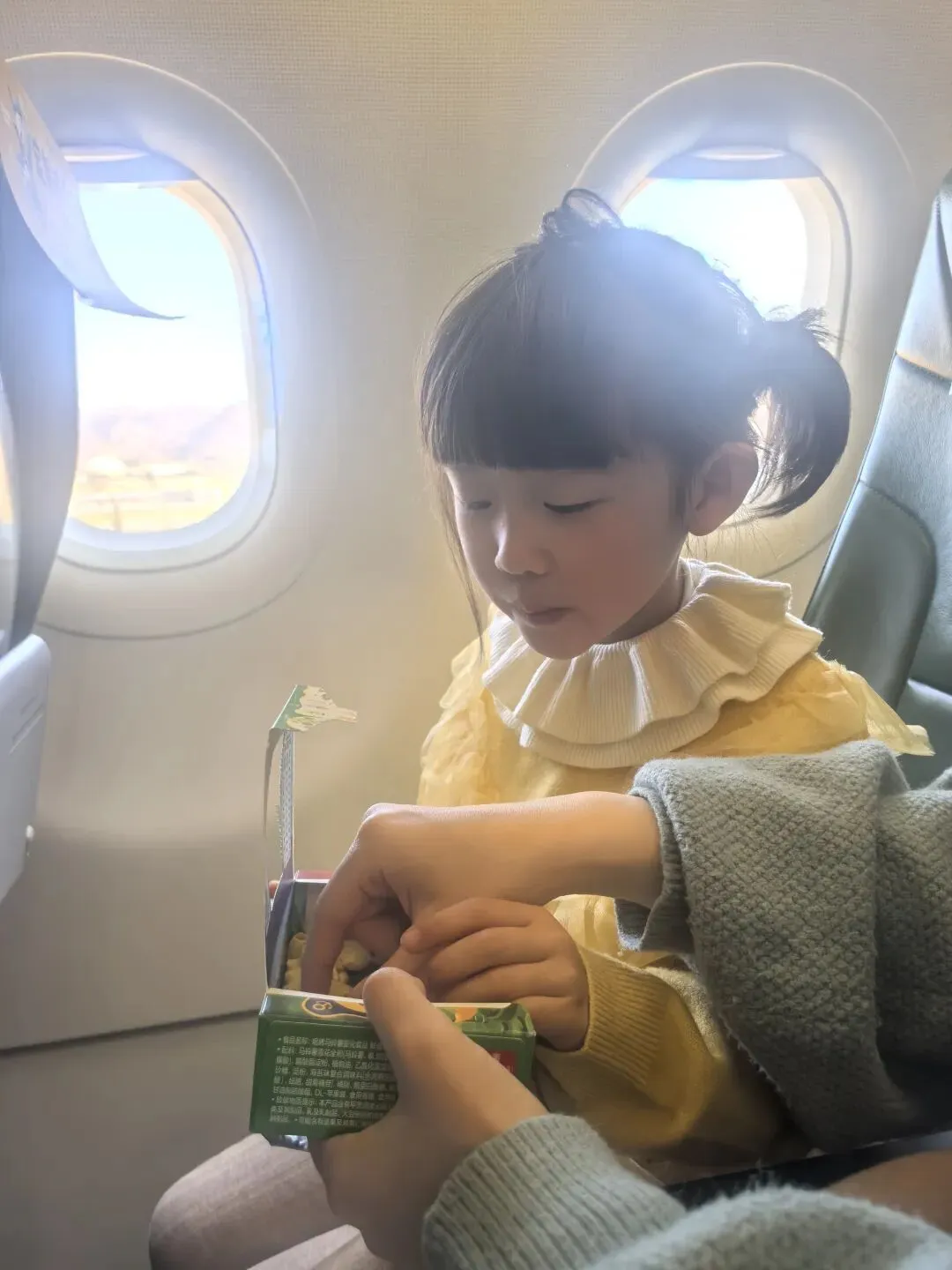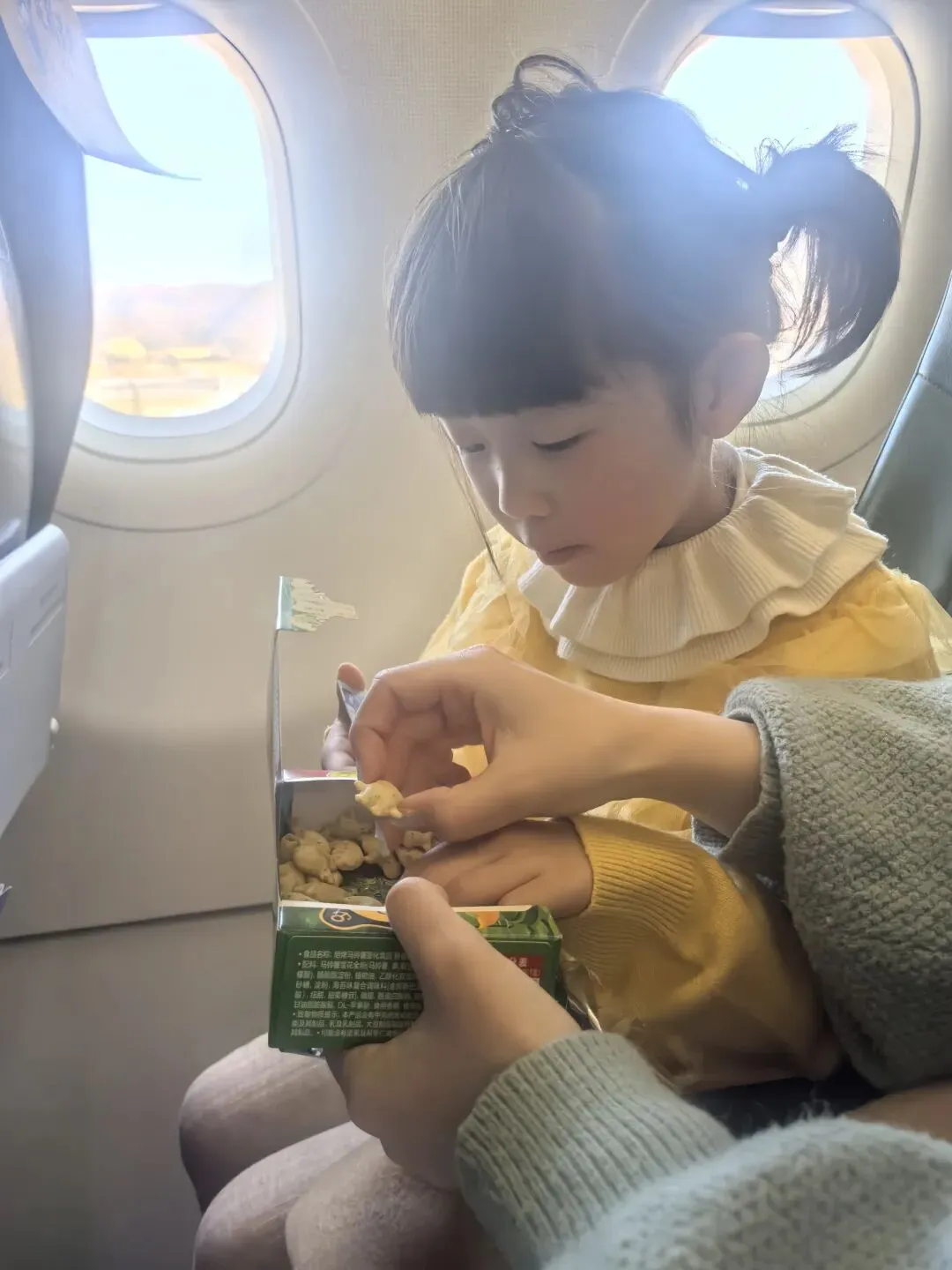 上飞机后我和姐姐一起吃好多鱼的小零食。