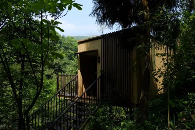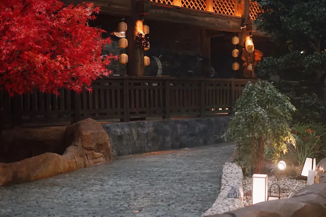 红枫与绿叶相衬,灯笼挂在房檐下,这环境颇有一番日式韵味。下池,浸泡在汤池之中,多种矿物质不仅有益健康,也消除了游玩后的疲惫。