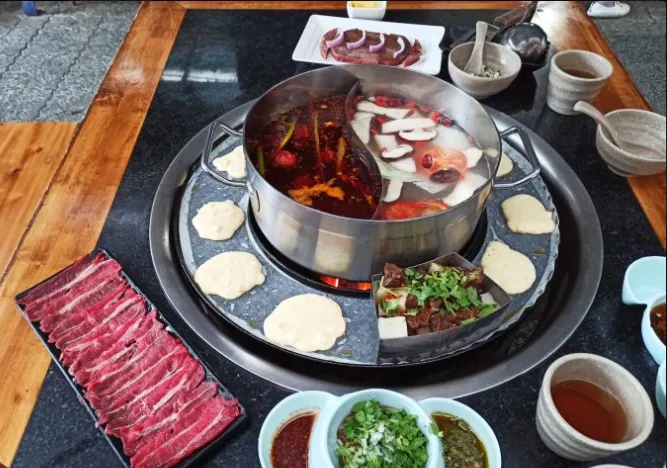 喜欢吃牛肉的话,就不要错过这家店了,中间是汤锅,四周还可以烤肉,多种吃法,多种味蕾享受,辣的,清淡的,一网打尽,锅边馍馍也是一大特色,老少皆宜。