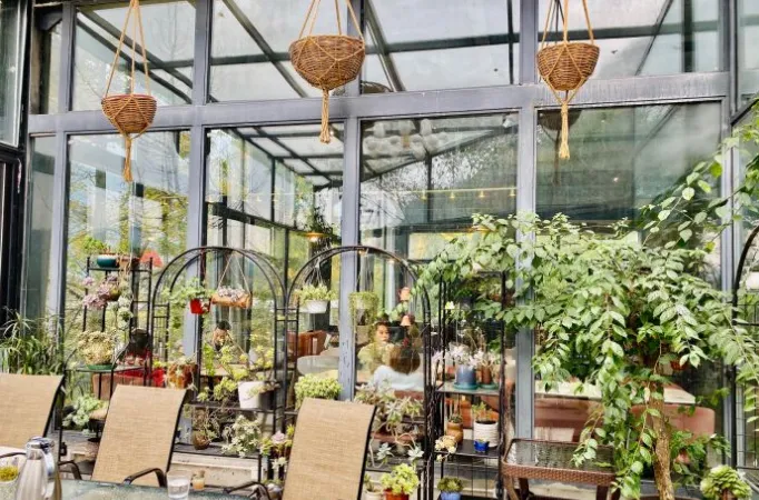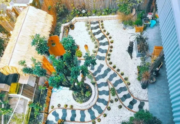 文庙山上,走近花霁门口,也未见到显眼的招牌,只是门框上方悬挂着的深蓝色棉布上,“花霁”二字若隐若现。院子不大,却被主人布置得很精致。白色鹅暖石几乎铺满整个地面,其间设置了三条小道,连通院子的各个角落。