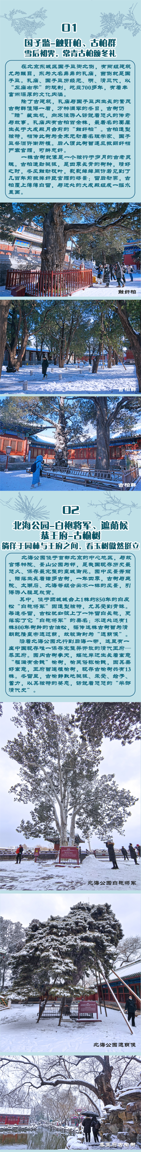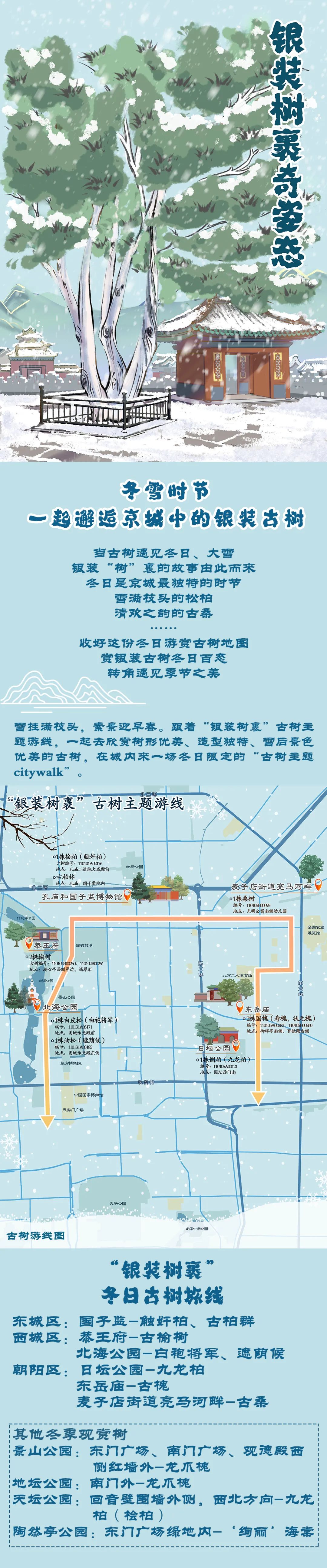 沿着“银装树裹”古树主题游线,在大雪纷飞之时,以赏树形优美、造型独特的古树为主,感受首都功能核心区和朝阳区内的王府、寺庙、公园等不同区域的古树雪景之美,共涉及孔庙和国子监博物馆、恭王府、北海公园、日坛公园、东岳庙、麦子店街道亮马河畔6处群状古树,循着游线,可观赏到圆柏、侧柏、榆树、白皮松、油松、槐树、桑树等多个树种的雪后美景。