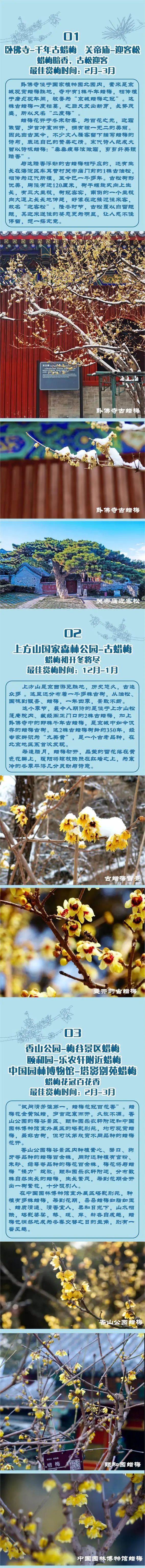 除了以上2条游线中的古树,北京还有大量独具特色的园林树木冬态景观供市民朋友们观赏。漫步古都,可赏冬日梅花,遒劲枝干,看枝桠作画,果实挂枝。您可以到香山公园、颐和园、中国园林博物馆观赏蜡质清透、暗香浮动的蜡梅;可以前往景山公园、天坛公园、地坛公园打卡弯曲盘旋的龙爪槐、树干奇特的九龙柏;还可在陶然亭公园欣赏枝头挂果的‘绚丽’海棠;公园内随处可见的柿子树,其挂满枝头的火红柿子既漂亮,又是鸟儿们的“冬日佳肴”。