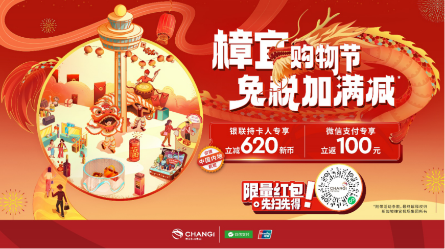 使用微信支付的乘客在机场商店和iShopChangi.com购物的时候累计消费满500RMB送100RMB代金券(可以是累计消费或一次性交易)。