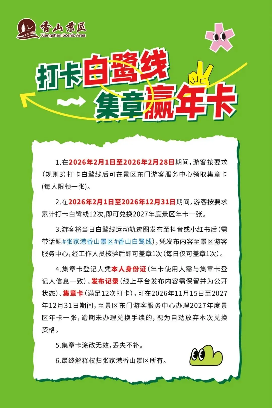 为全力营造舒适游览环境、促进旅游品质提升,结合景区管理需要,自2026年2月1日(星期日)起,暂停香山景区望江路入口早晚锻炼,恢复开放时间另行通知。有早晚锻炼需求的市民、游客朋友,可前往香山湖区域领略湖光山色、享受惬意时光。诚挚感谢您的理解和配合!