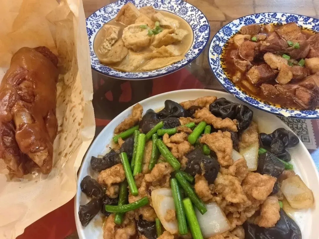 终于轮到我坐下,菜一上来这份量又惊到我了,猪蹄儿是刚才看到很多人排队没忍住买的,这边儿点了三个菜,两个碗菜还是要的小份,红烧肉一碗全是肉,没有垫底、没有素菜!