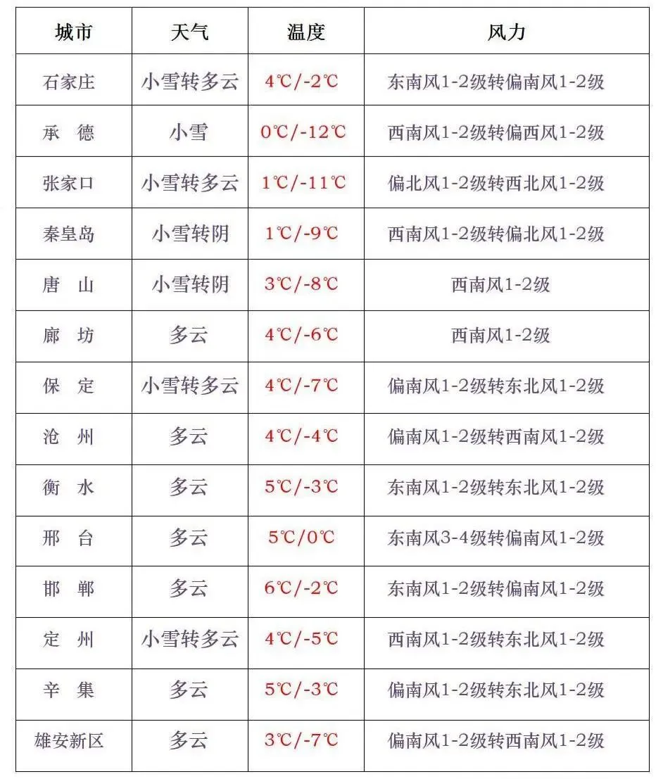 【全省大部分区域有雪】今天(1月30日),降雪范围将覆盖到全省大部分区域;受云量和降雪影响,近两天全省最高气温有所下降。石家庄小雪转多云,-2~4°C;雄安新区多云,-7~3°C;北京小雪转多云,-5~0°C。