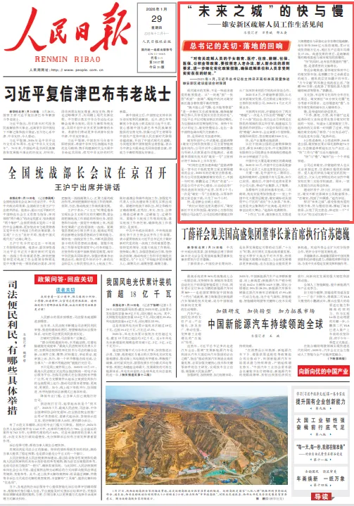 人民日报1月29日关注河北雄安新区:“未来之城”的快与慢——雄安新区疏解人员工作生活见闻。