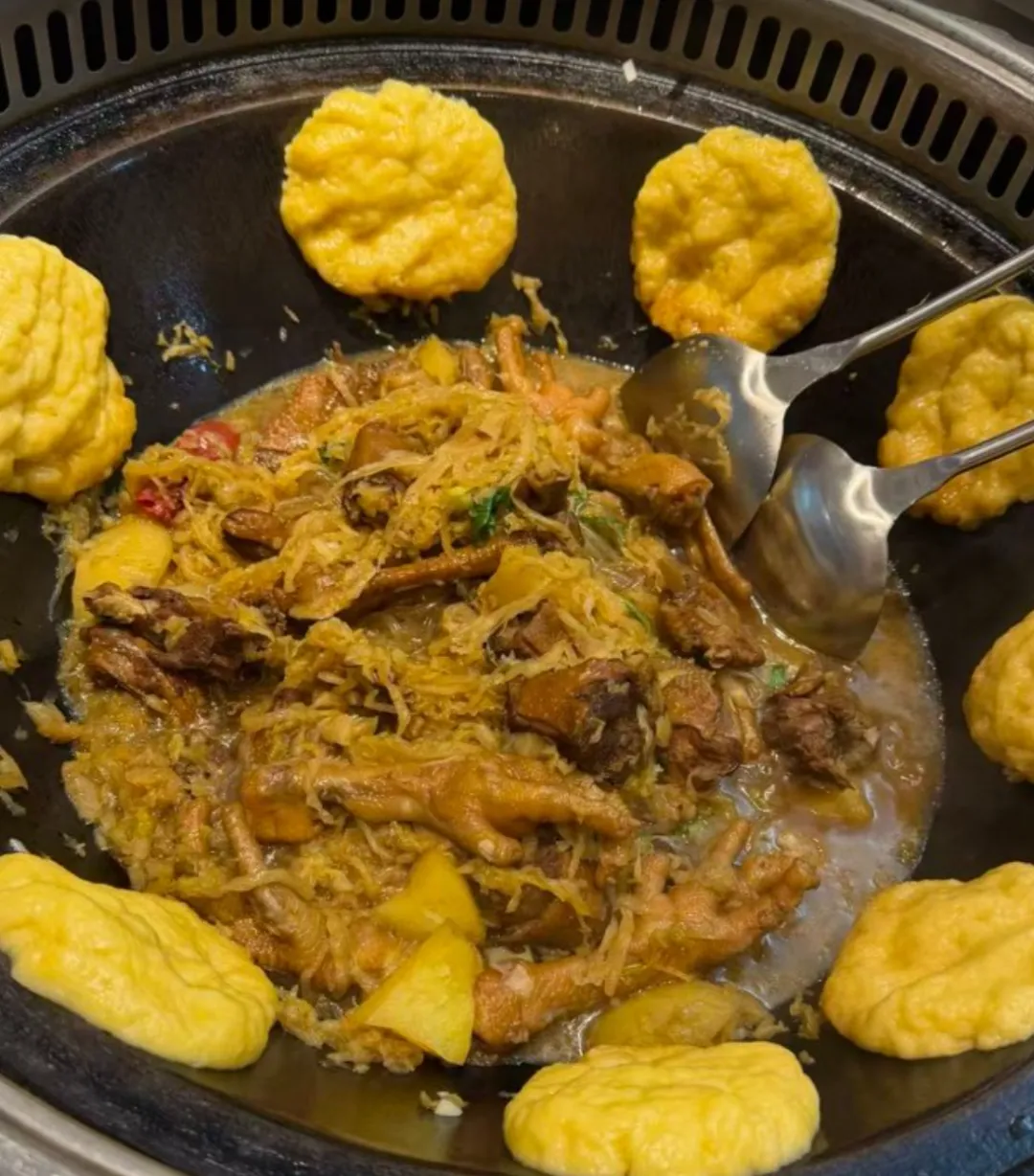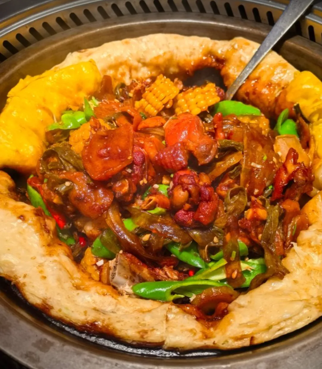 铁锅炖以铸铁锅为器,柴火或炭火加热,最能锁住食材本味。常见搭配是排骨、鸡块或大鹅等主料,提前焯水去腥后,和东北大酱、香料炒出香味,再加入土豆、玉米、宽粉条、干豆角等吸汁配菜,加足热水慢炖。炖制时可在锅边贴一圈玉米饼,饼底焦脆、吸满汤汁。出锅时热气腾腾,肉烂脱骨,配菜裹着浓醇酱香,玉米饼外酥里糯,围坐同食满是烟火气,是东北人冬日暖胃的标配。