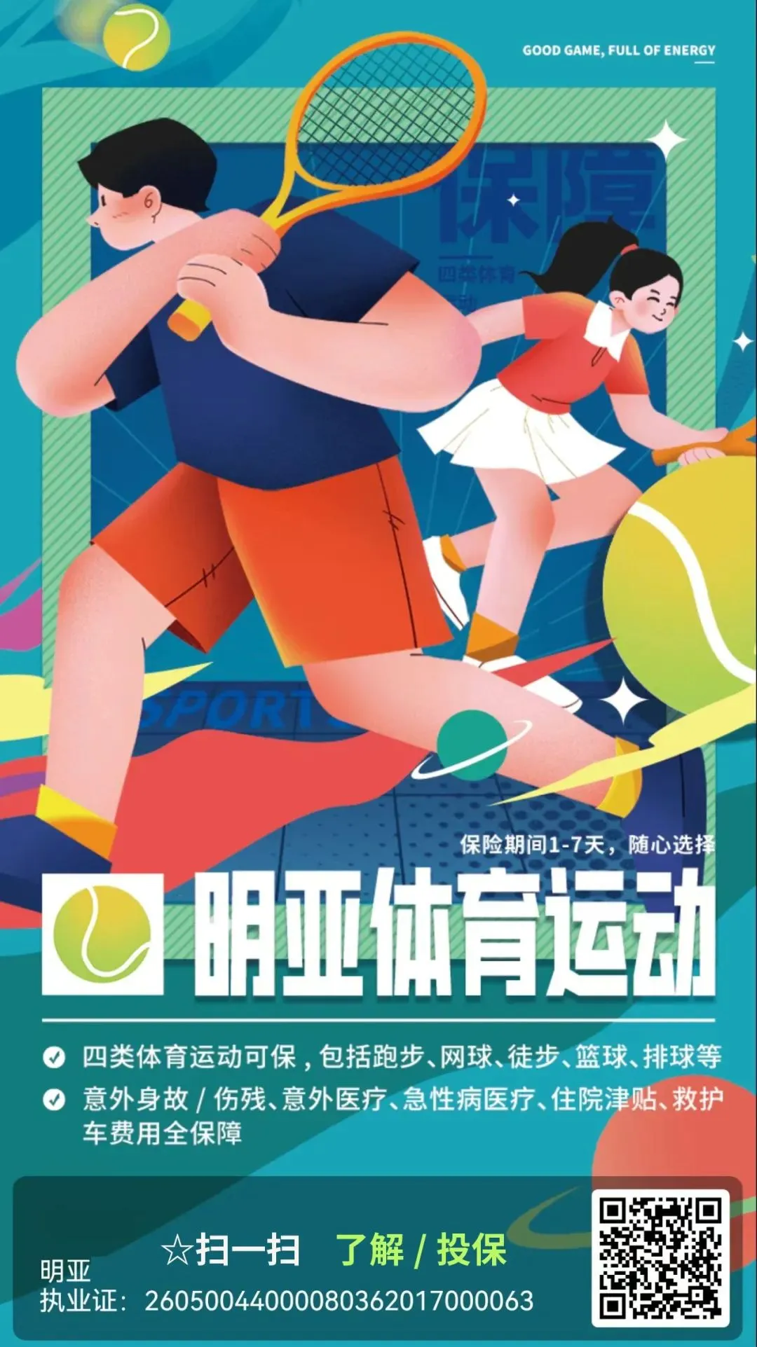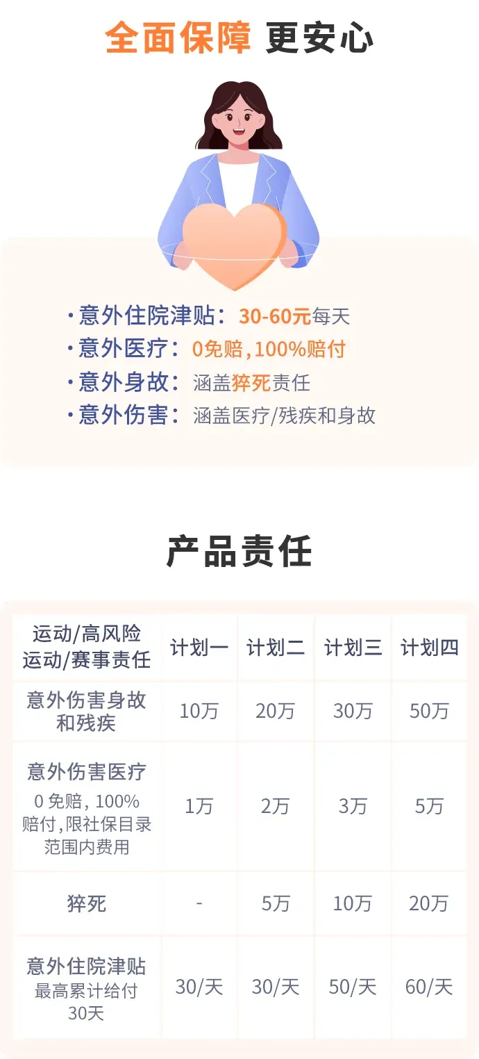 ✔团体/个人都可投,四大类体育运动包含球类、室内攀岩等;意外身故/伤残保险金额最高80万,猝死/医疗/津贴/救护车/交通……可选当日生效