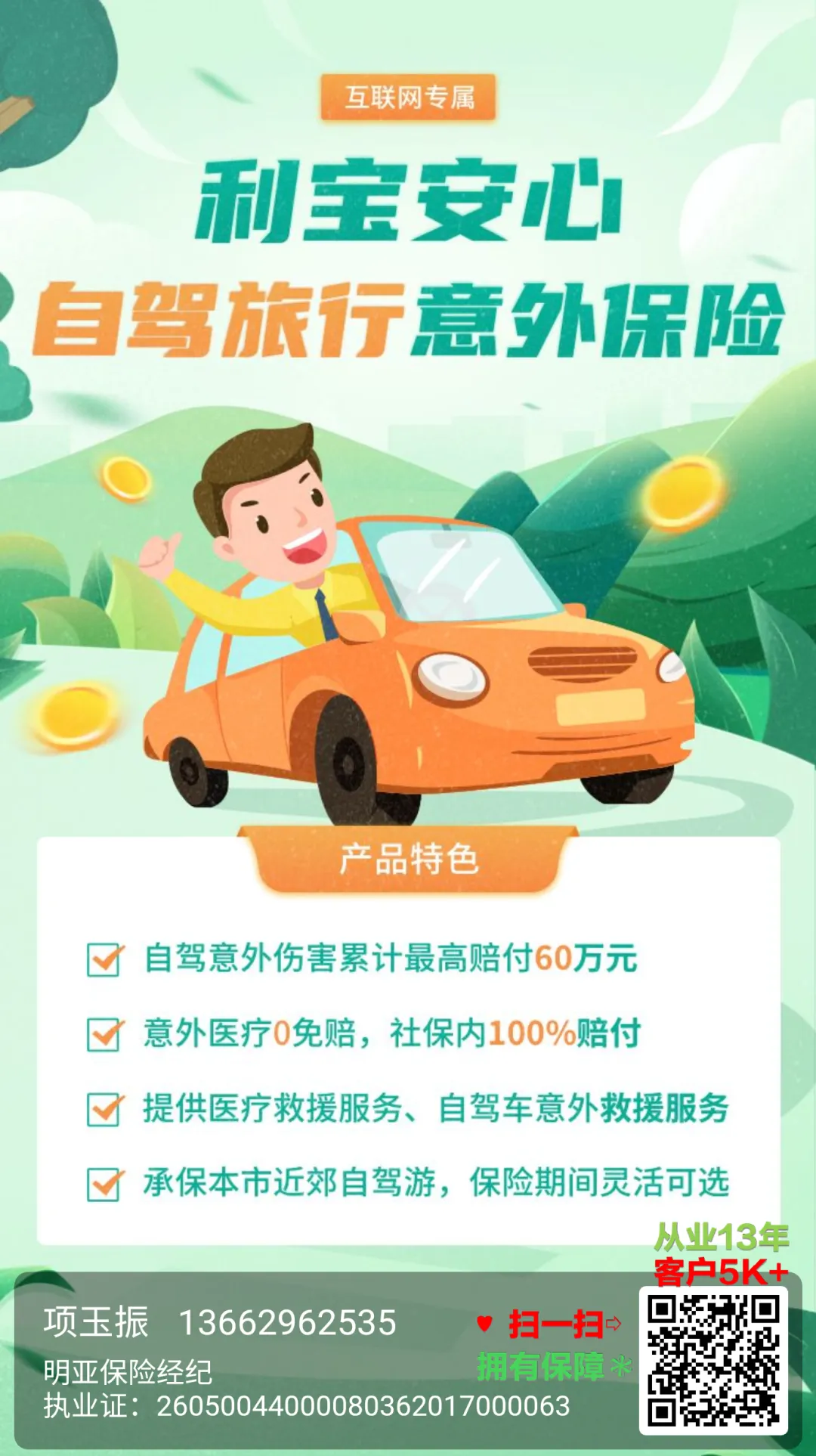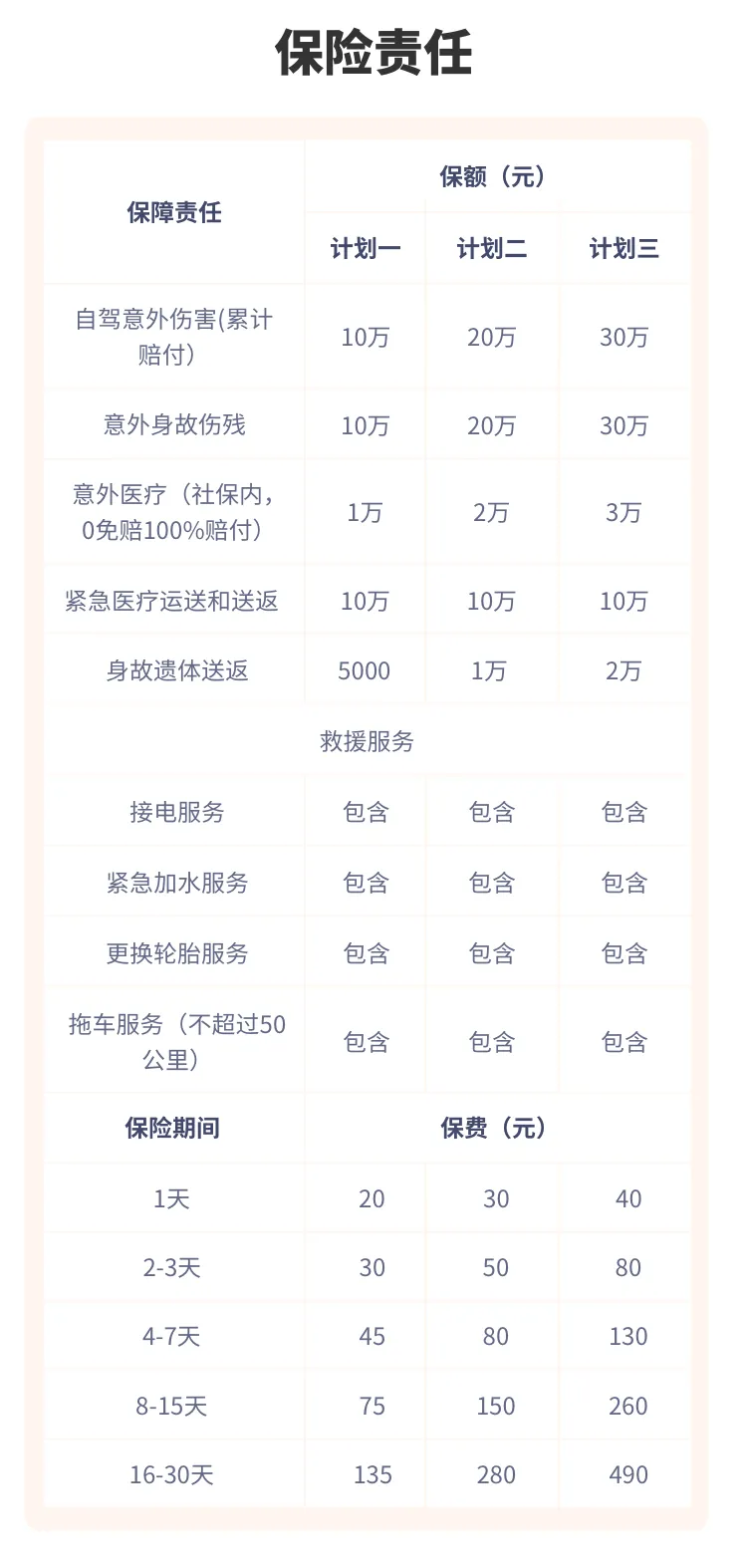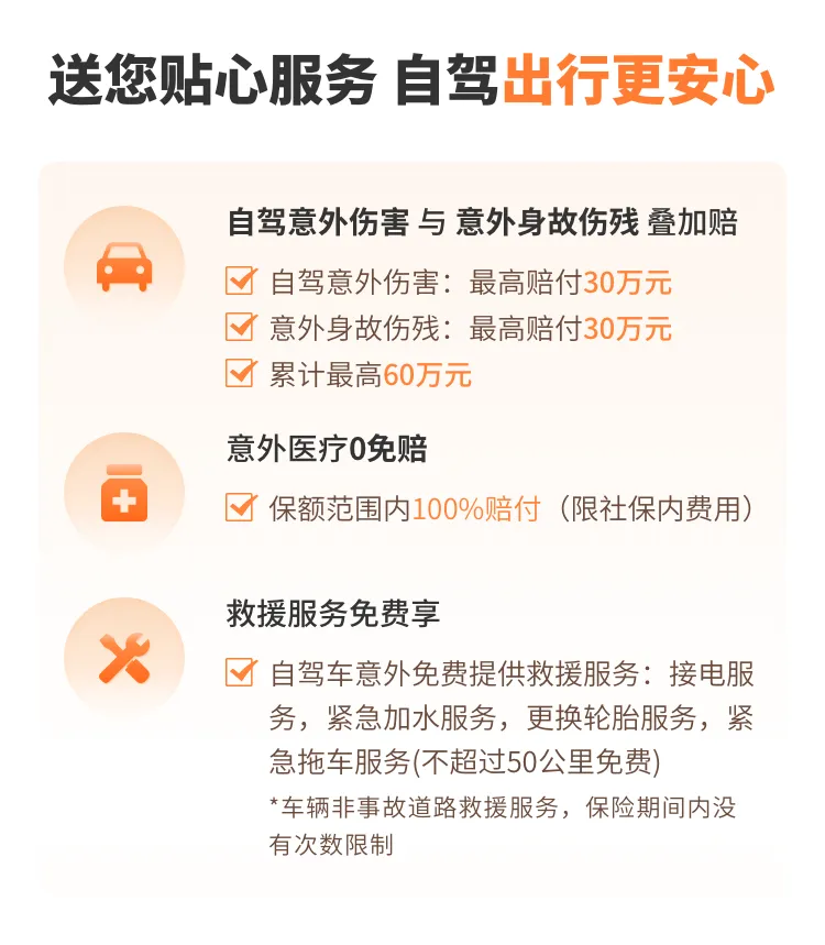 18-65岁可保;¥20↗ 保障期间:1-30天 ✔保自驾游期间各种意外的人身和医疗保障;免费救援服务:接电、加水、换轮胎、拖车等;支持外籍投保