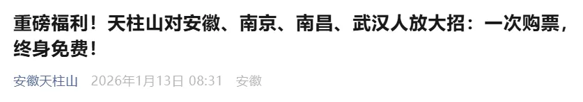 同时,江西、广东、广西三省群众2026年1月1日至2月16日(除夕)享齐云山景区免门票(含逍遥街门票)