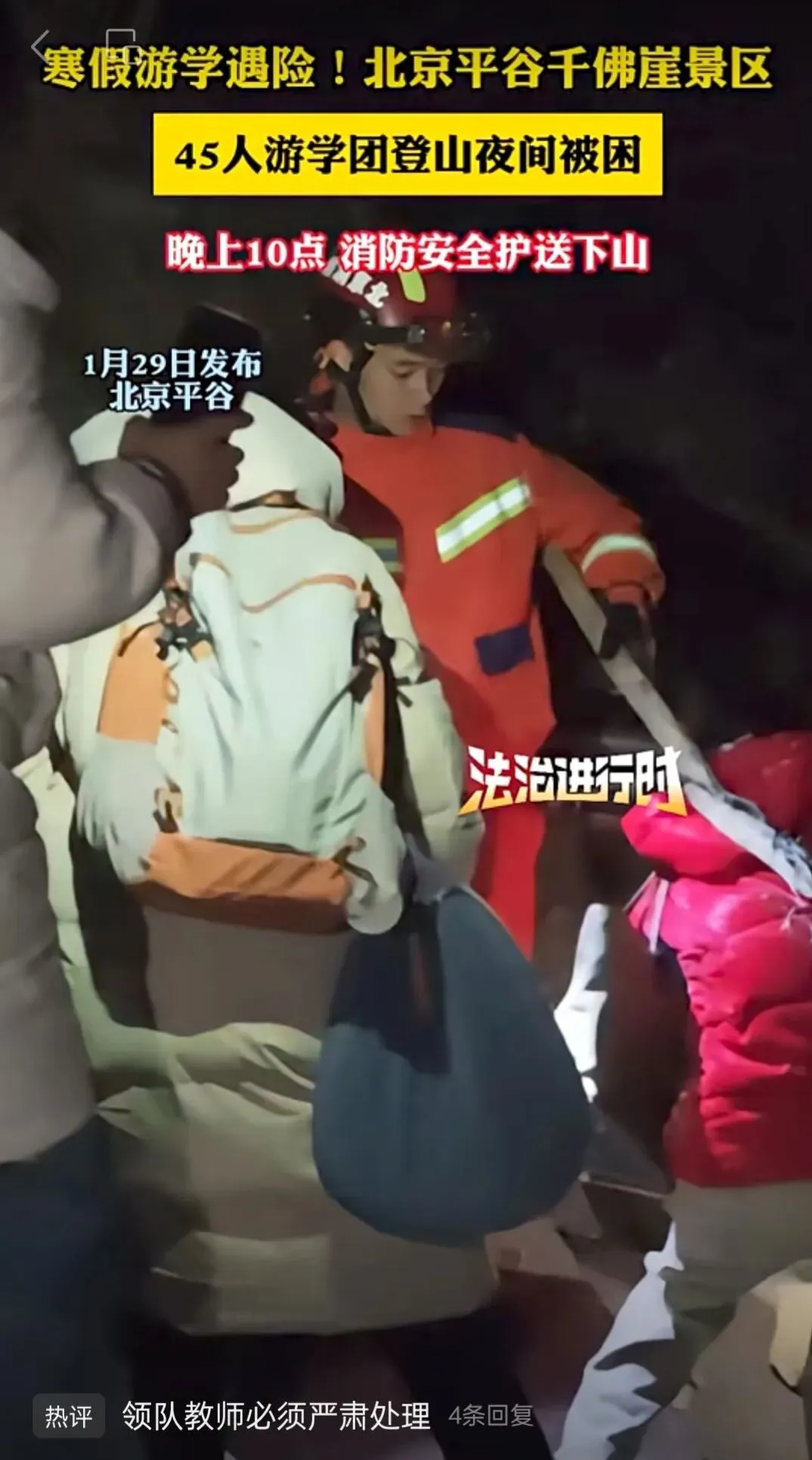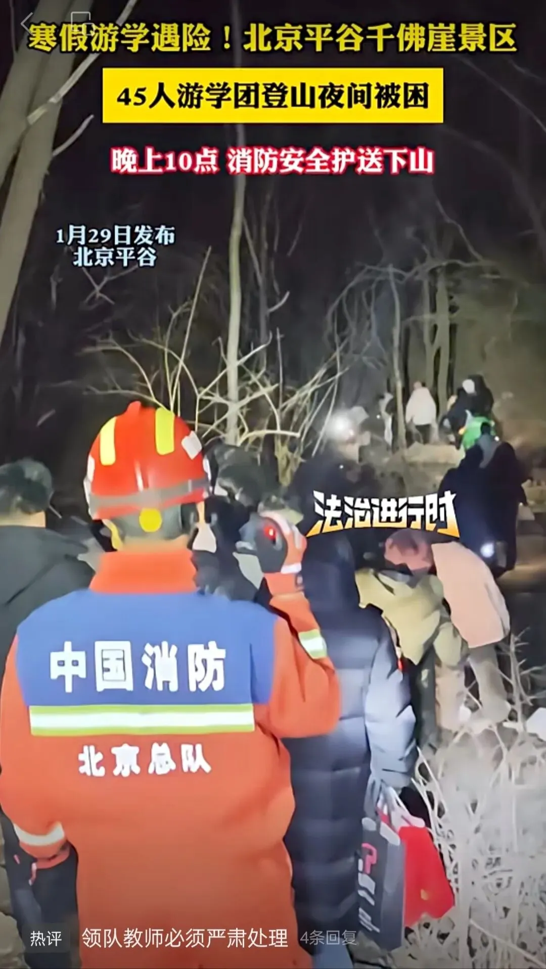 据法治进行时视频号发布,平谷千佛涯景区,寒假游学遇险!45人游学团登山夜间被困,晚上10点,消防安全护送下山!