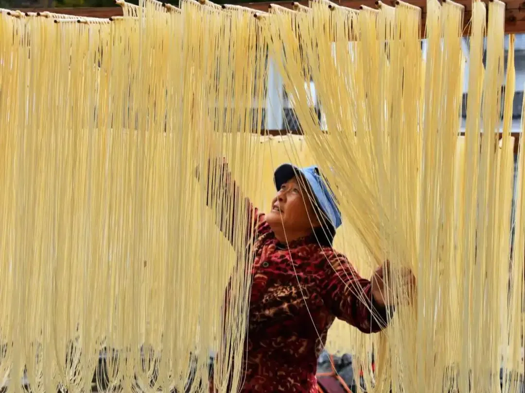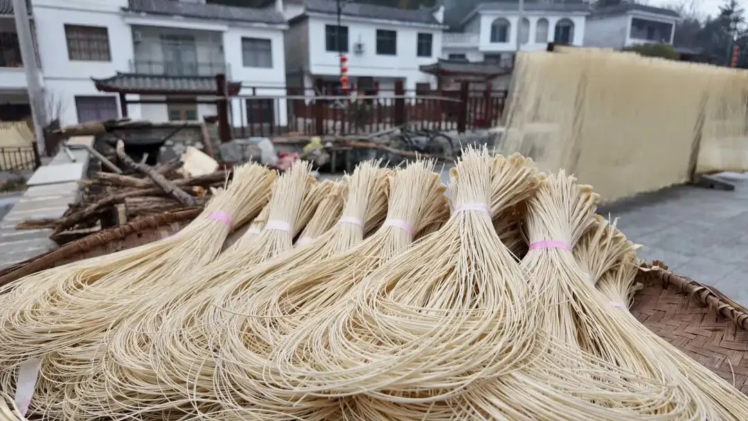 手工扯油面,是大别山年俗里的烟火暖意。老师傅手法娴熟,揉面、醒面、扯拉一气呵成,一根根纤细筋道的油面,晒干后莹白透亮。煮一碗配上年货鸡汤,鲜爽入味、暖胃暖心,每一口都是儿时记忆里的家乡滋味。