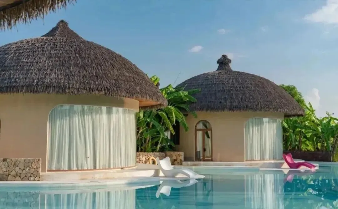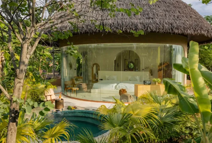 12间独栋Villa蘑菇屋,散落在山水之间,茅草屋顶与芭蕉林,再搭配热带绿植,充满东南亚风情。