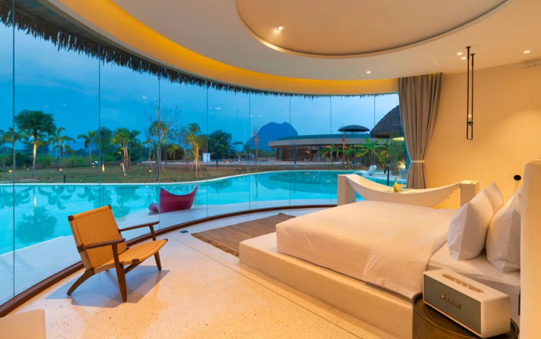 ▲图源/崇左在野宿集水野间、川野间皆配180°全景落地窗与环形泳池,凭窗对望连绵山川,白日揽天光映水,夜晚观星河铺池。