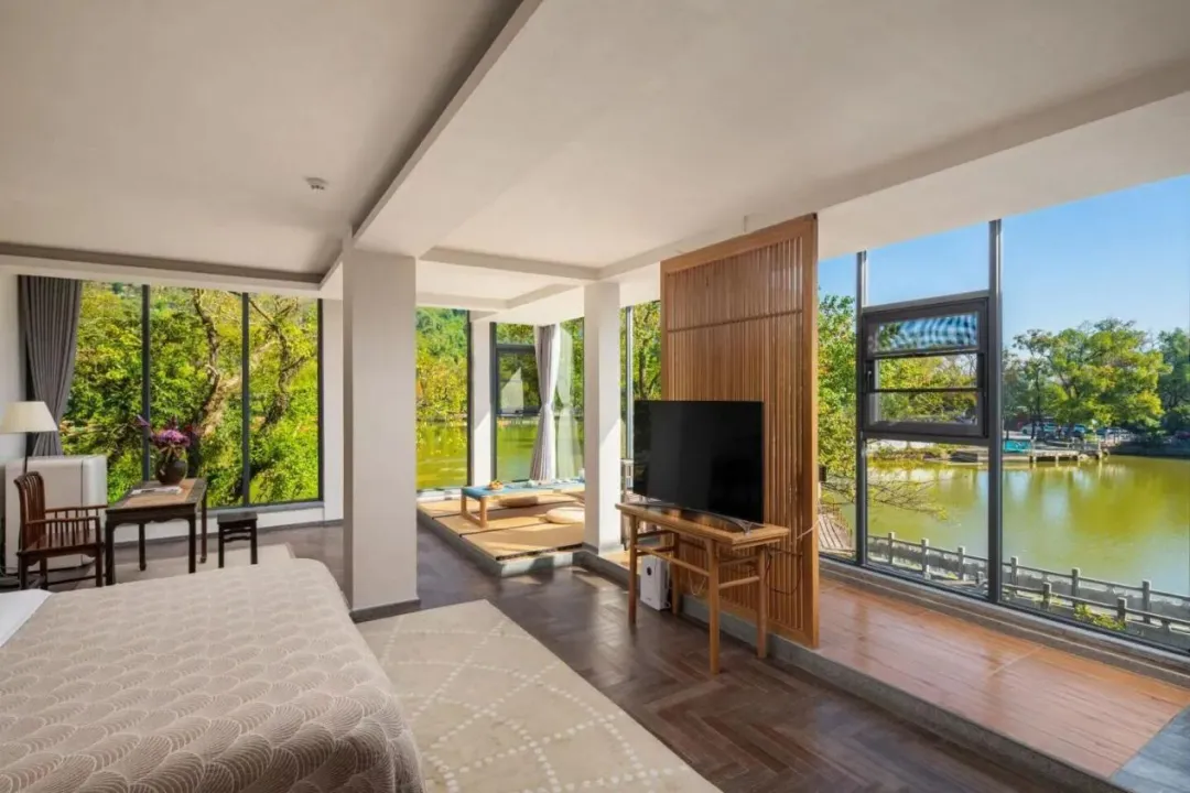 民宿枕水而居,静立黑水河之上,三面环水的悠然格局,将对岸的山水奇境尽揽眼底。踏入此间,便与尘世喧嚣温柔作别,独拥一方静谧私密的度假天地。