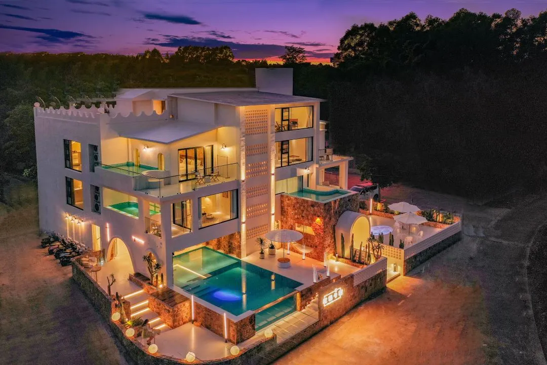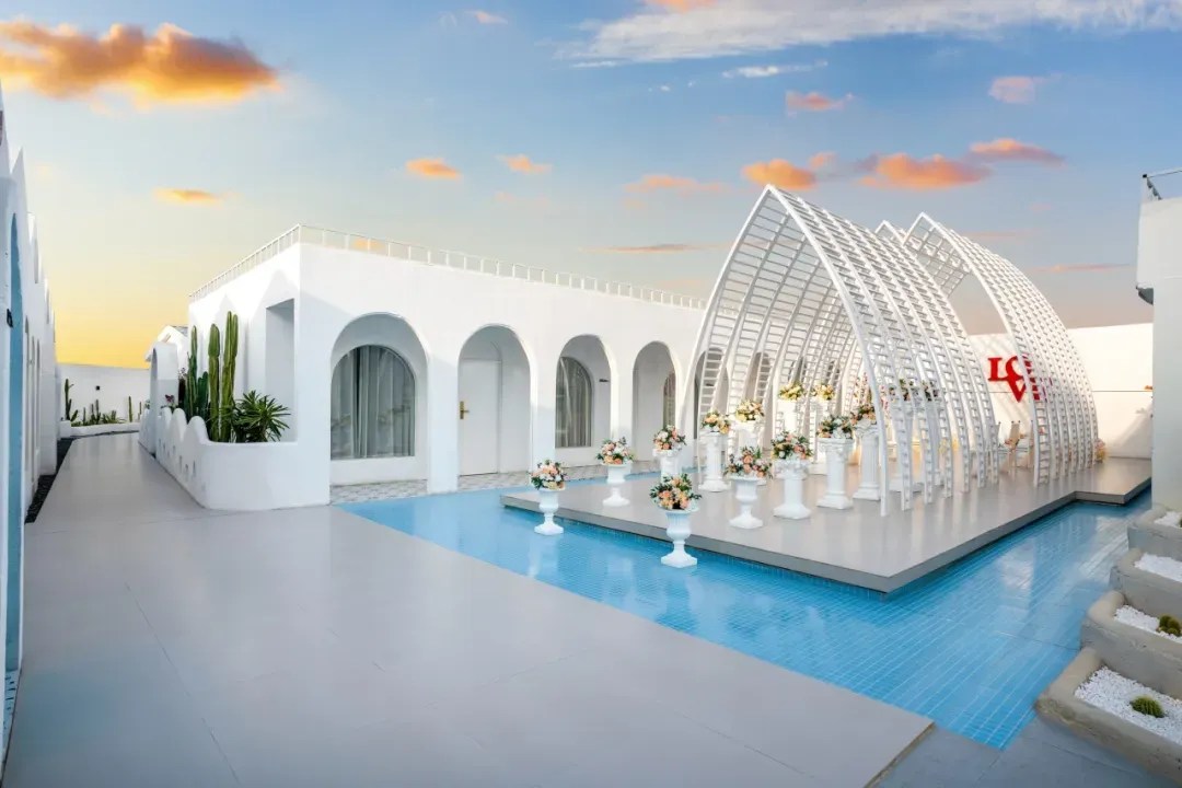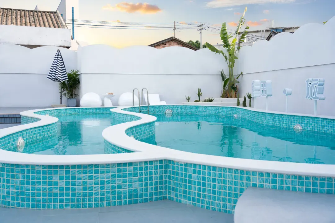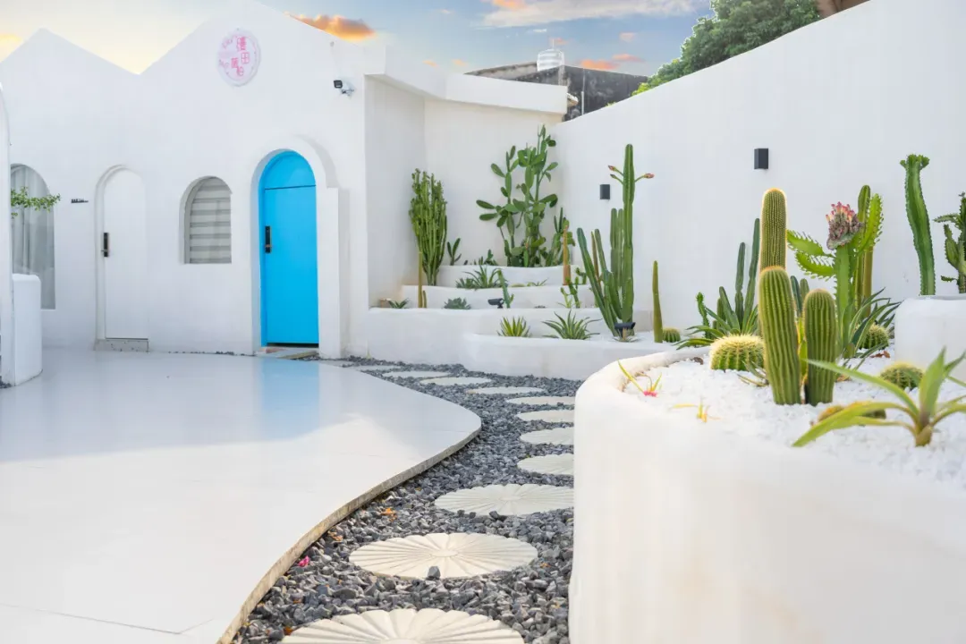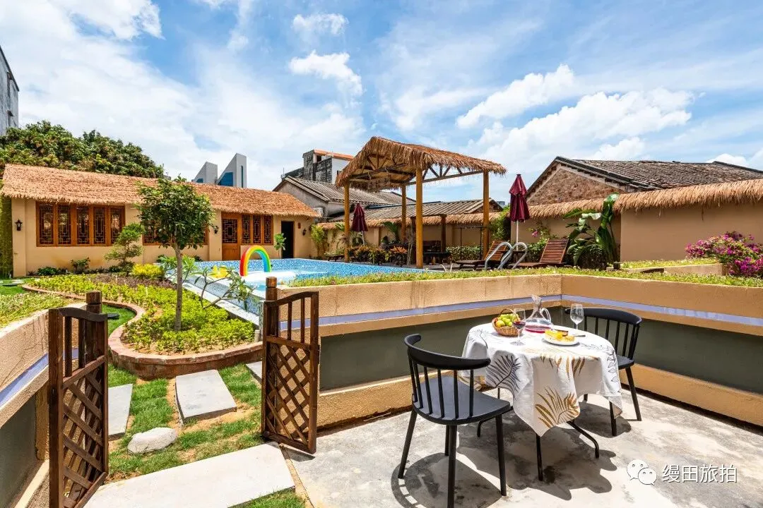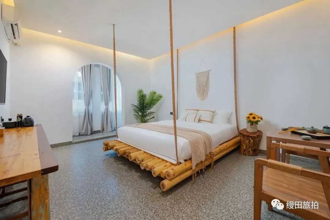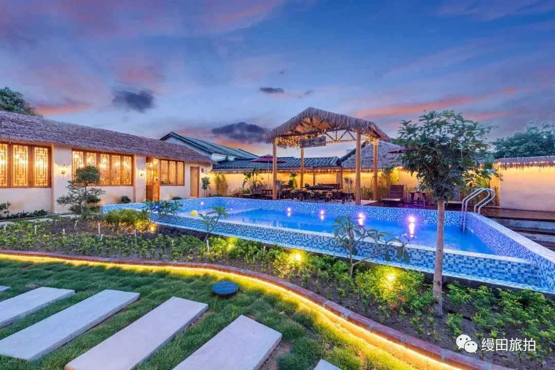 缦田旅拍美宿位于广西北海,主打独栋庭院式建筑,一院一景。推开民宿大门,映入眼帘的是天蓝方砖泳池与白色的建筑,在椰子树、热带植物的衬托下,仿佛置身地中海边的圣托里尼。