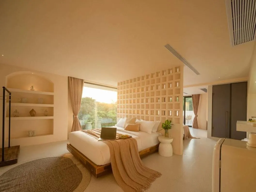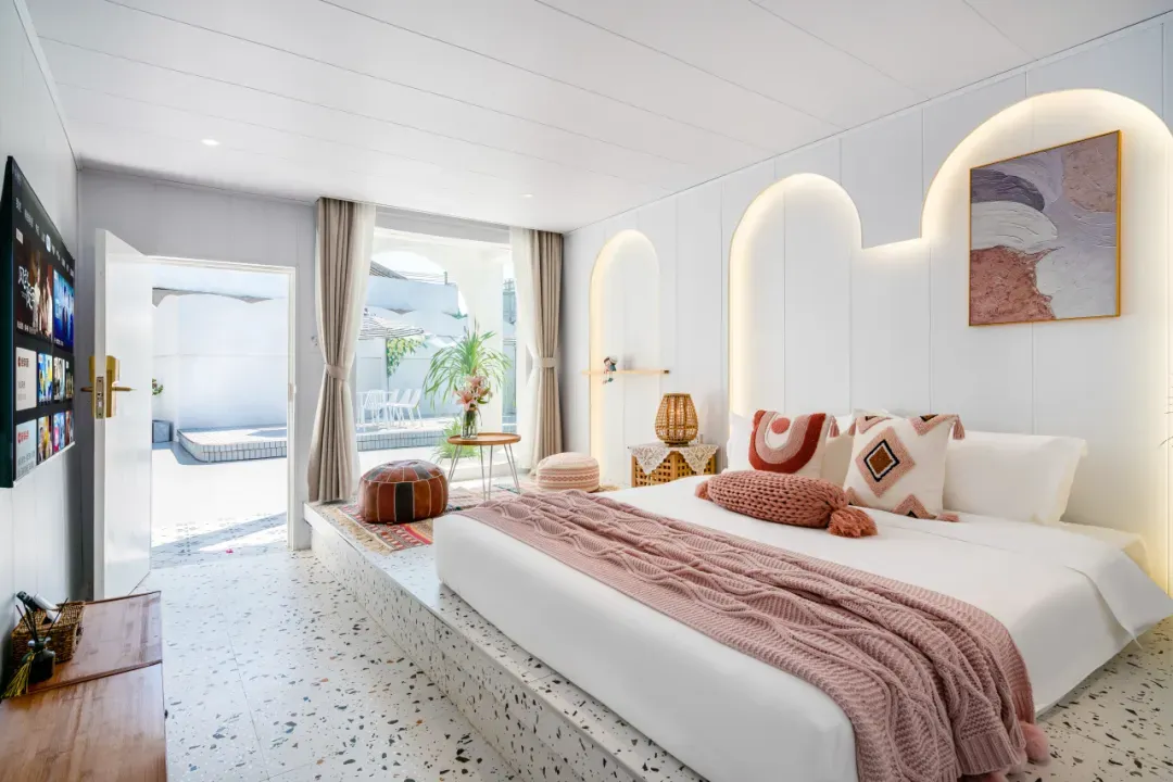 全屋微水泥通铺,一体式动线设计,尽显简约雅致的质感。温柔的奶油色调晕染出软糯温馨的氛围,纯白建筑与热带绿植、简约几何线条相映,与窗外的蓝天碧海浑然相融,目之所及,每一处角落皆藏巧思,满是设计美感。