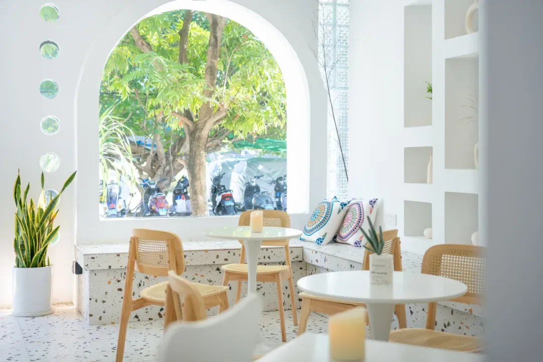 顺着巷子走,错落有致的建筑,极简风的桌椅,温柔的颜色宛如甜蜜的奶油冰淇淋,瞬间融化了少女心,这里是很童话的场景,民宿的每一处都超好拍、超出片,从内到外,民宿把白色调运用到了极致。