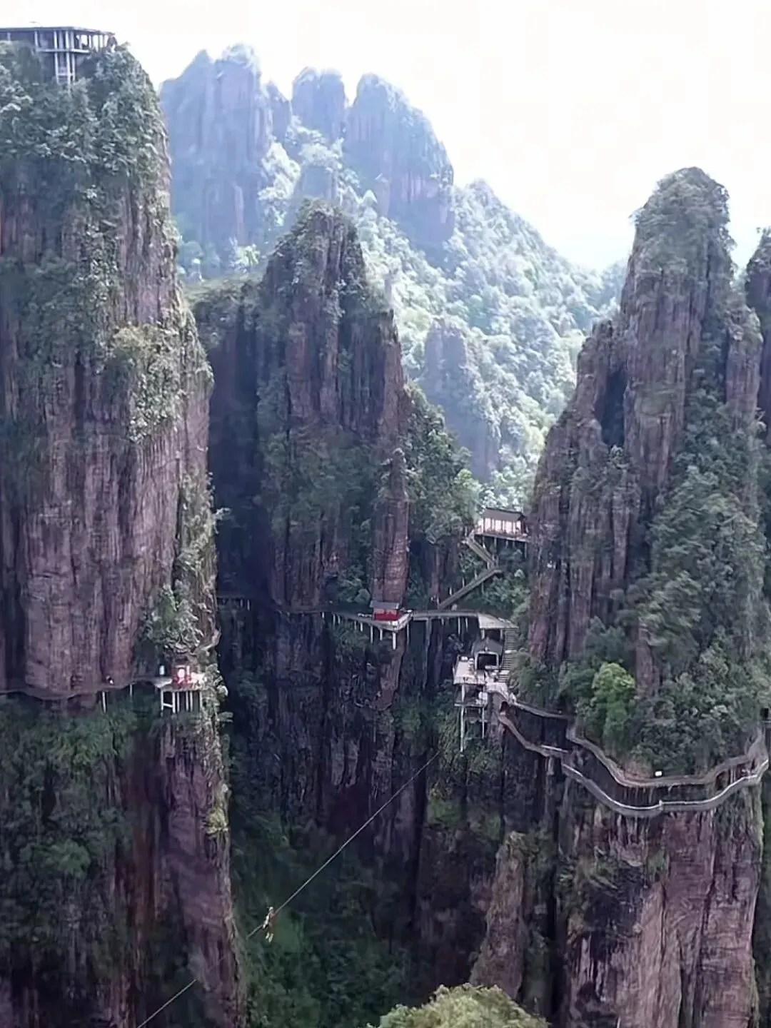 穿防滑运动鞋(部分栈道悬空),避免高跟鞋。雷雨天缆车停运,提前看天气预报。