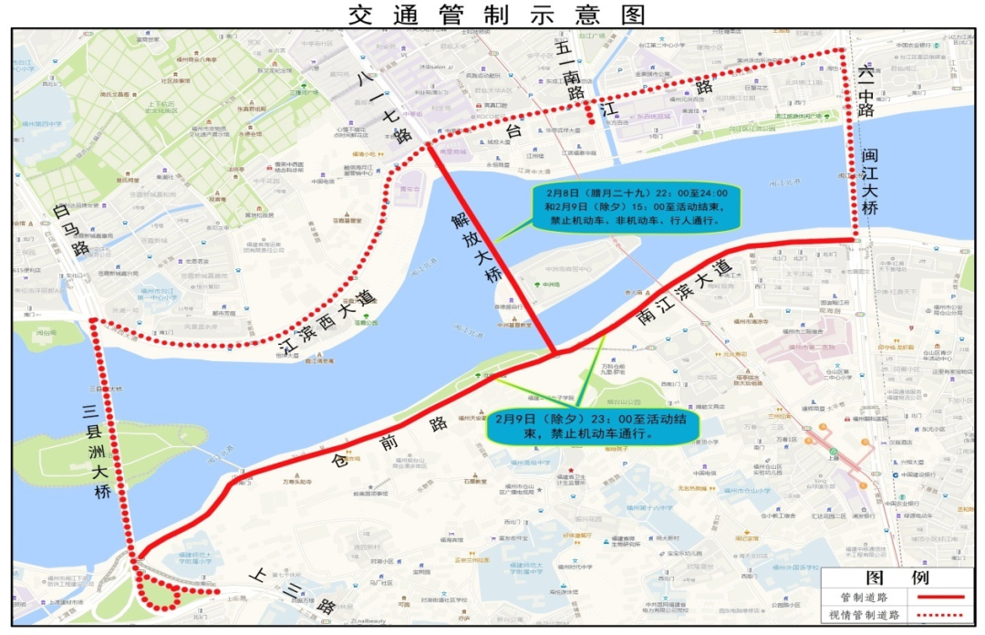 二、2月9日(除夕)23:00至活动结束,南江滨大道(解放大桥至闽江大桥下)、仓前路禁止机动车通行。