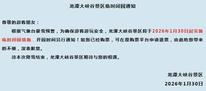 龙潭大峡谷景区 根据气象台暴雪预警,为确保游客游玩安全,龙潭大峡谷景区于2026年1月30日起实施临时闭园措施,开园时间另行通知。