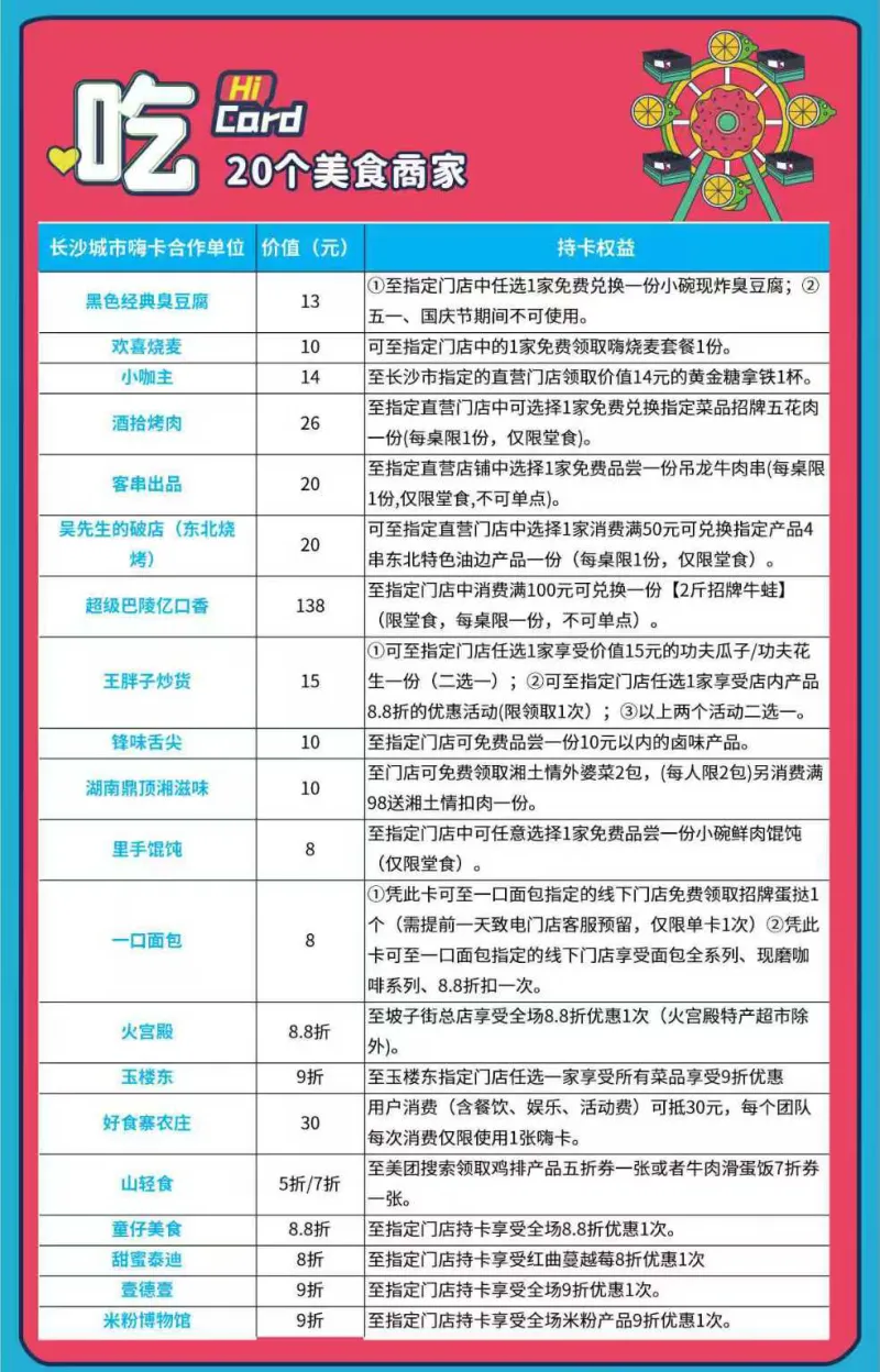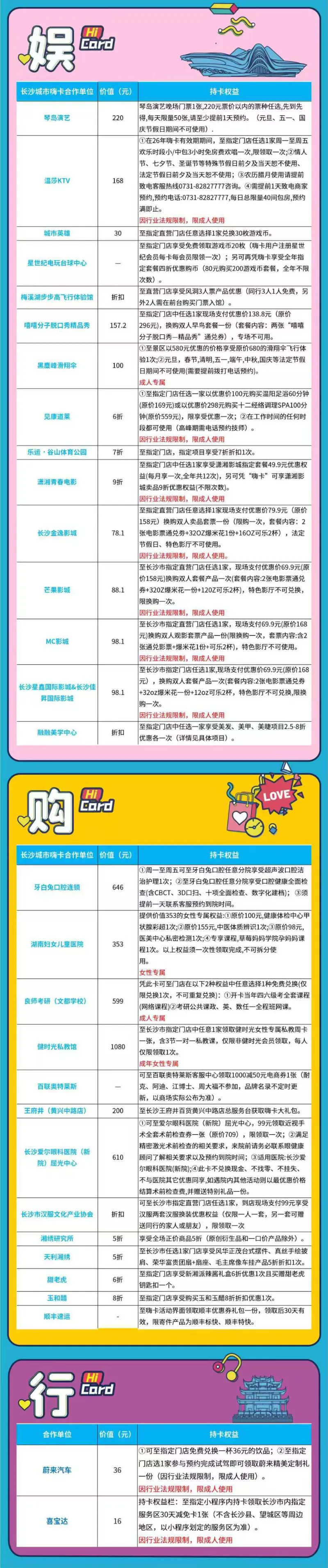 一张”长沙城市嗨卡“包含“吃、行、游、购、娱“5大要素,可享受价值超6000元+的权益覆盖长沙超100+明星商家专享优惠,并且随着品牌商家的不断增加将来可以带来种种不同惊喜。)