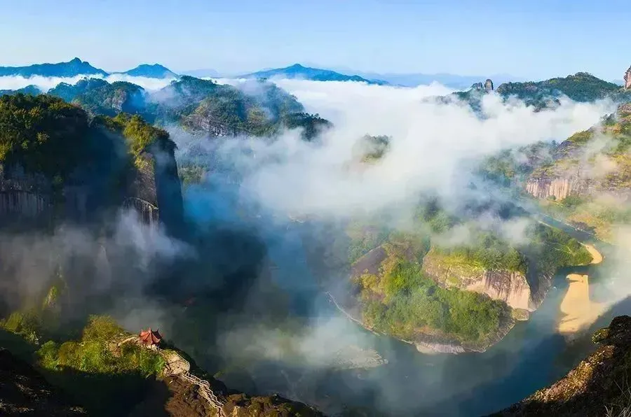 早餐后游览武夷山【竹筏九曲溪漂流】(约1.5小时),迂回曲折,环绕武夷山九曲十八湾,曲曲山回转,峰峰水抱流,视野开阔,抬头可见山景,俯首能赏水色。伸手可触清泉。游览武夷宫(时间半小时)、仿宋古街、武夷山博物馆(可参观千年悬棺)、武夷山名人馆等。