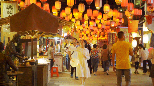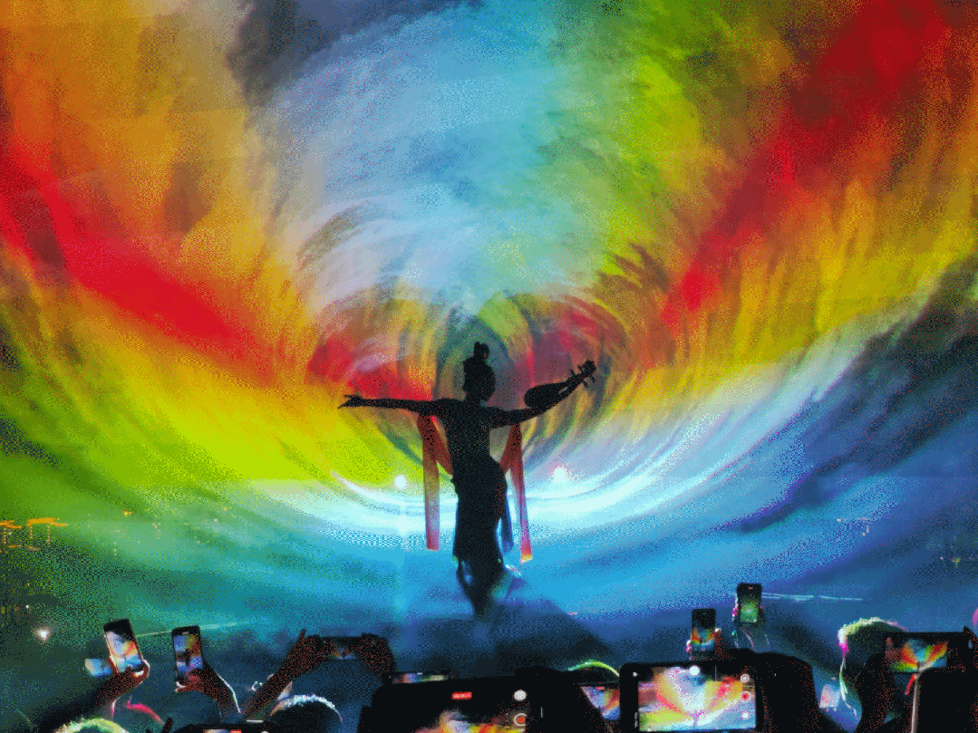 配上夜晚璀璨灯光、演绎、篝火