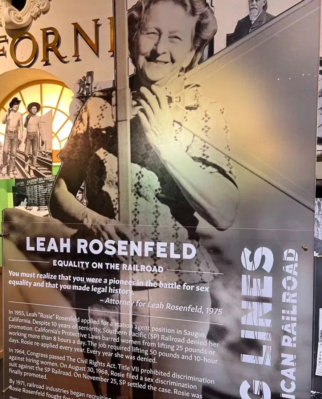 Crossing lines: Women of the American railroad专题,这个专题不像很多博物馆会专门开一个展厅,这个专题则是在整个博物馆内不同区域都设置了展板,介绍不同阶段和不同场景时女性所做的工作,包括参与火车设计、帮助工人获得合法权益、争取女性参与到铁路工作当中的权益。 这样的专题相较于单独的展厅,更融入其中,覆盖到的游客更广。