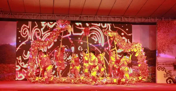 受新罗区文化体育和旅游局邀请,西城街道舞龙队的舞龙表演《龙飞凤舞》作为开幕式文艺晚会的开场节目首先亮相。西城街道舞龙队由西安社区11名舞龙队员组成。伴随着铿锵有力的锣鼓声,舞龙队队员们在龙珠的引导下,快速有力的舞动着“巨龙”,或昂首摆尾,或伏地打滚,或腾跃飞奔,或穿梭盘旋……精湛的表演赢得在场观众阵阵喝彩,队员们用灵动的表演,向观众充分展示了中国龙文化的特有魅力,吸引了上千名市民驻足观看,博得台下观众的阵阵掌声,为文艺晚会渲染了浓厚的文化氛围。