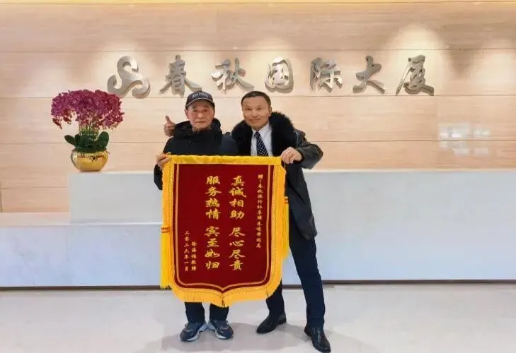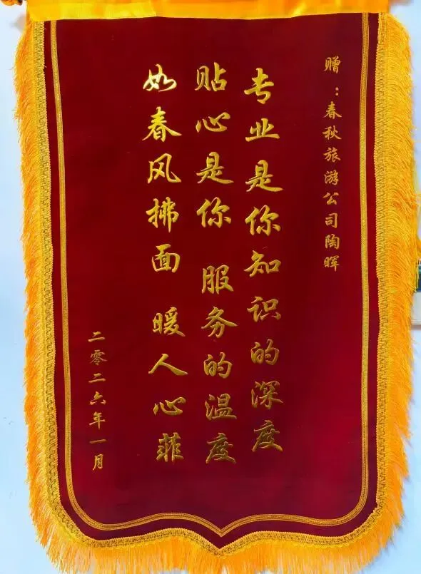 一位春秋老客户亲自上门来送锦旗,他动情说道:在旅程中我妻子身体不适,领队朱进荣给予我们很多照顾,还帮忙和航司沟通解决飞机座位事宜,更是在我无线网路故障时,主动和我分享他的无线WIFI,专业又暖心的服务让人倍感温暖。